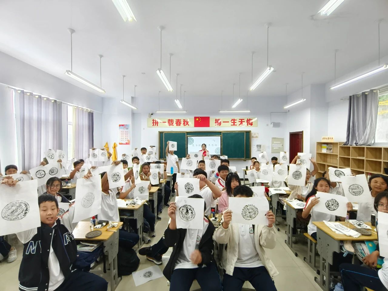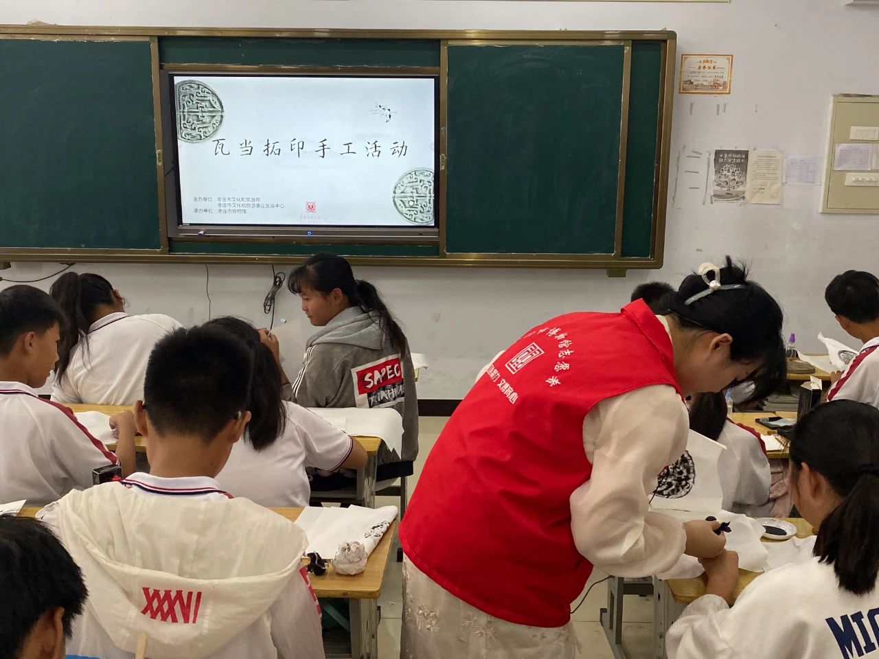 社教老师首先从瓦当概述、烧制流程、瓦当纹饰等三个方面讲述了瓦当的知识,结合视频演示了瓦当拓印的每一个操作步骤,之后在社教老师的指导帮助下,同学们开始动手制作自己的瓦当拓片。看似简易的步骤其实并没有那么简单,一不小心墨刷多了,印出来的黑糊糊一大片,线条就显得笨重。刷版的力度要刚刚好,一气呵成,中间千万不能停顿,否则着墨就不均匀了。同学们一次次尝试,反复试验,不敢有丝毫马虎。功夫不负有心人,一幅生动的拓印版画终于印好了,快来看成品吧!