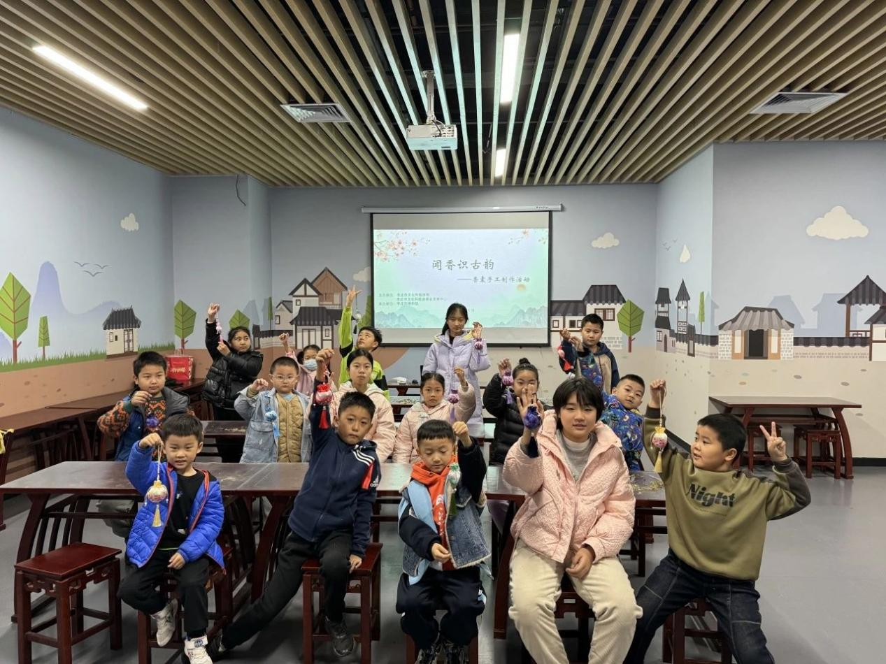随后社教老师将制作香囊的材料分发给同学们,并讲解了制作香囊的方法和注意事项。活动现场,香料的清香阵阵扑鼻,经过同学们认真仔细的制作,一个个精巧的香囊出现在大家手中。