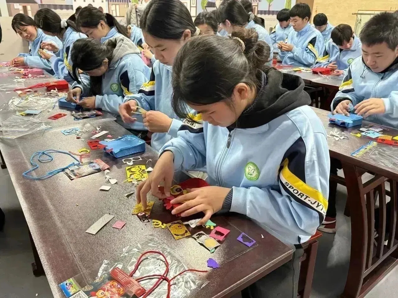 随后,孩子们在社教老师的帮助下亲手制作了印有卡通龙图案的斜挎包。通过缝制、粘贴等步骤,大家都精心制作出了属于自己的作品。他们们洋溢着开心的笑容,争先恐后地展示着成果。