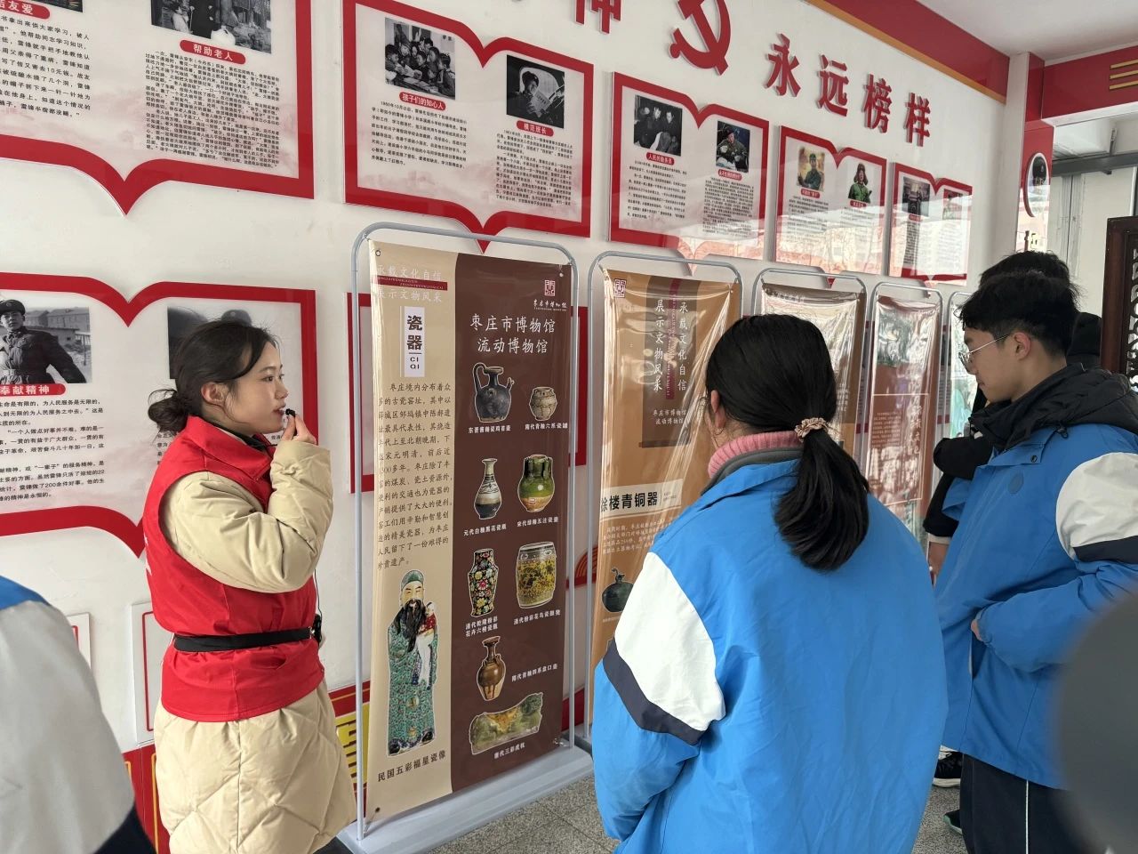 文物的守护和传承,关键是要让文物“活”起来。为推动中华优秀传统文化创造性转化、创新性发展,由枣庄市文化和旅游局、枣庄市文化和旅游事业发展中心主办,枣庄市博物馆、滕州市滕东中学承办的“课桌上的博物馆”进校园活动于12月28日走进滕州市滕东中学,该活动是枣庄市博物馆“博物馆之友”的特色年度活动,志愿者讲解员们以枣庄历史、文物资源为切入点,借助移动展板和社教课程,让师生沉浸式体验博物馆文化。