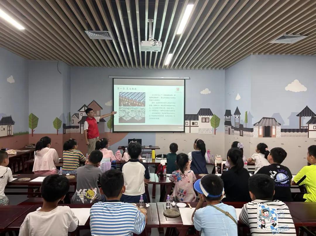 社教老师首先从瓦当概述、烧制流程、瓦当纹饰三个方面讲述了瓦当的知识,让孩子们了解瓦当这项由绘画、书法、文学、建筑、雕刻等门类综合共蕴的艺术。之后通过视频展示了拓印瓦当的制作流程,社教老师详细示范了每一个操作步骤。