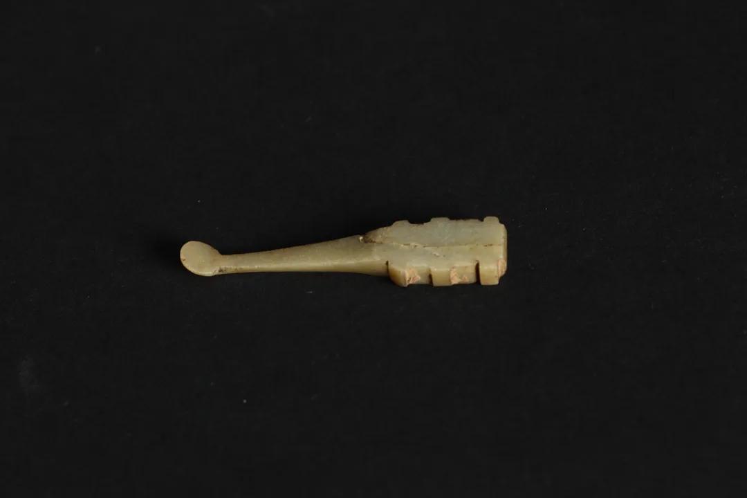 春秋青玉挖耳勺,长4.3厘米,柄宽0.9厘米,厚0.4厘米,2002年山亭区山城街道办事处东江遗址出土,现收藏于枣庄市博物馆。长条形,勺头近圆形,内凹,圜底。长条扁柄,末端较宽,两侧各有两缺口。通体磨光。