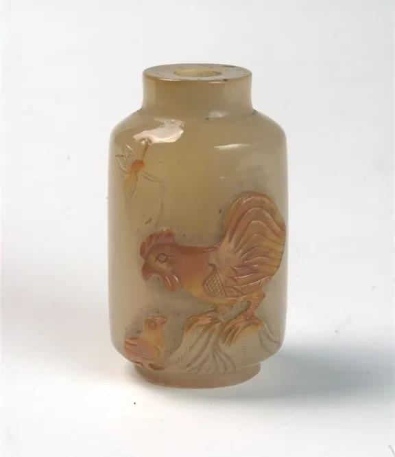 清玛瑙鼻烟壶,口径2.1厘米,腹径3.4厘米,高5.7厘米,现收藏于枣庄市博物馆。直口,平沿,沿面微内凹,溜肩,直腹,圜底,假圈足微内凹。腹部浅浮雕刻有蜜蜂、雄鸡及雏鸡图案。雕刻精细,通体光滑。