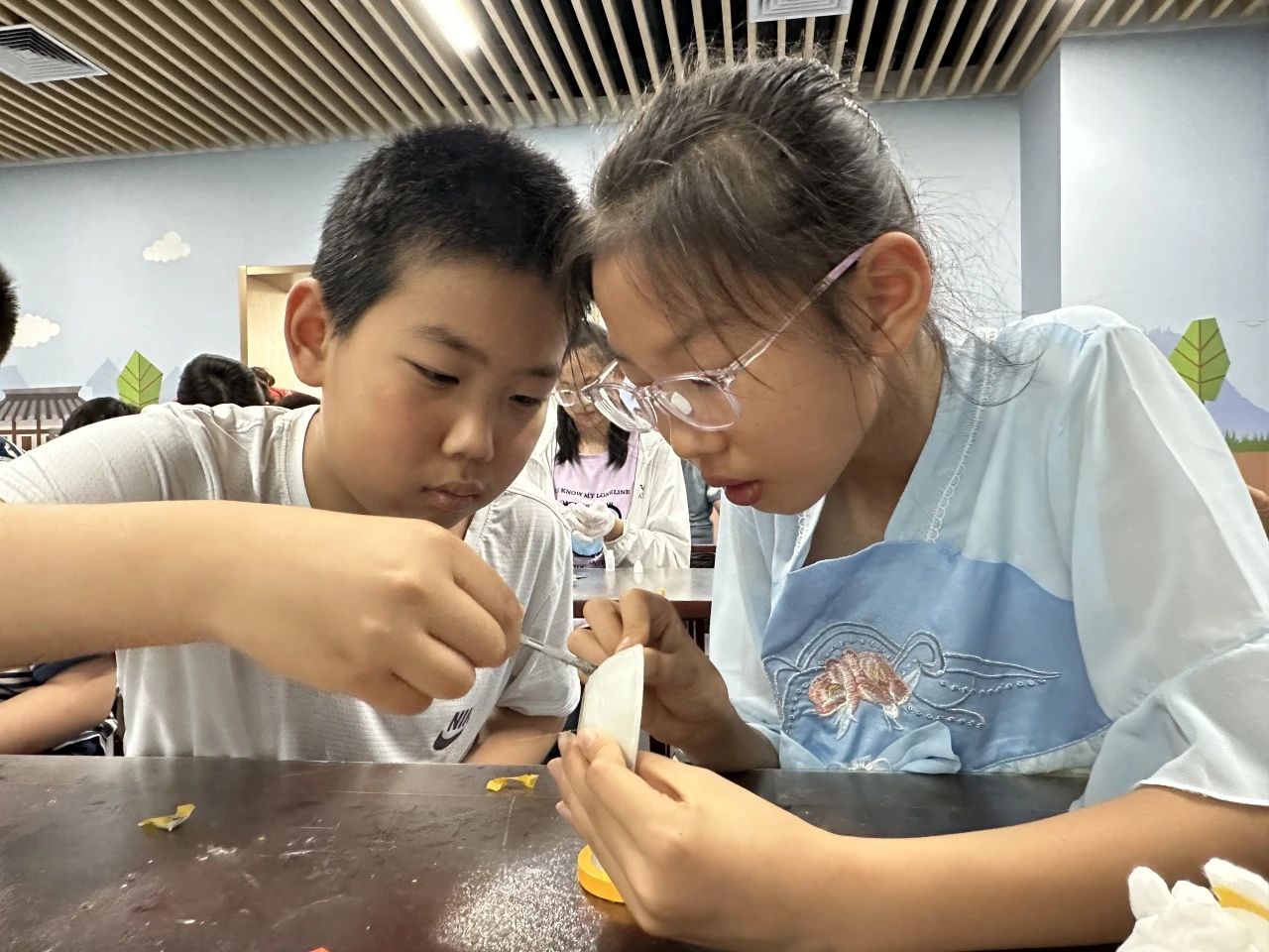 收到“考古盲盒”后,每位“小小文物修复师”在开始修复前,都认真学习了修复的注意事项。“出土文物”破损比较严重,同学们小心翼翼地整理碎片,先拼出“文物”轮廓,再认真修缮,不放过一个细节,不落下一点儿碎片,用耐心和细致让青花瓷碟重新焕发光彩。