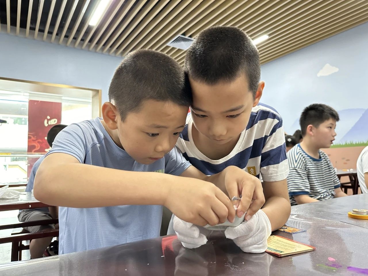 接下来,在社教老师的辅助下同学们开始了“文物”修复的操作过程。