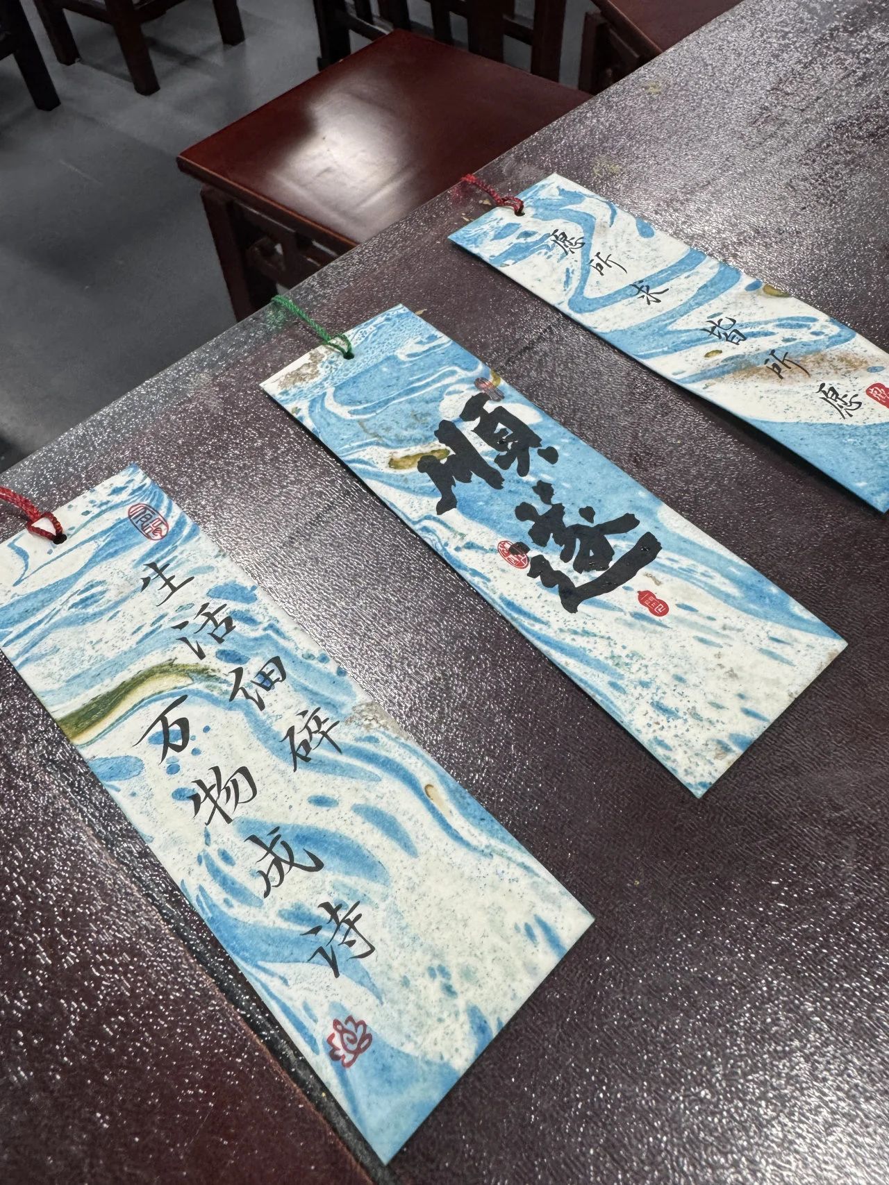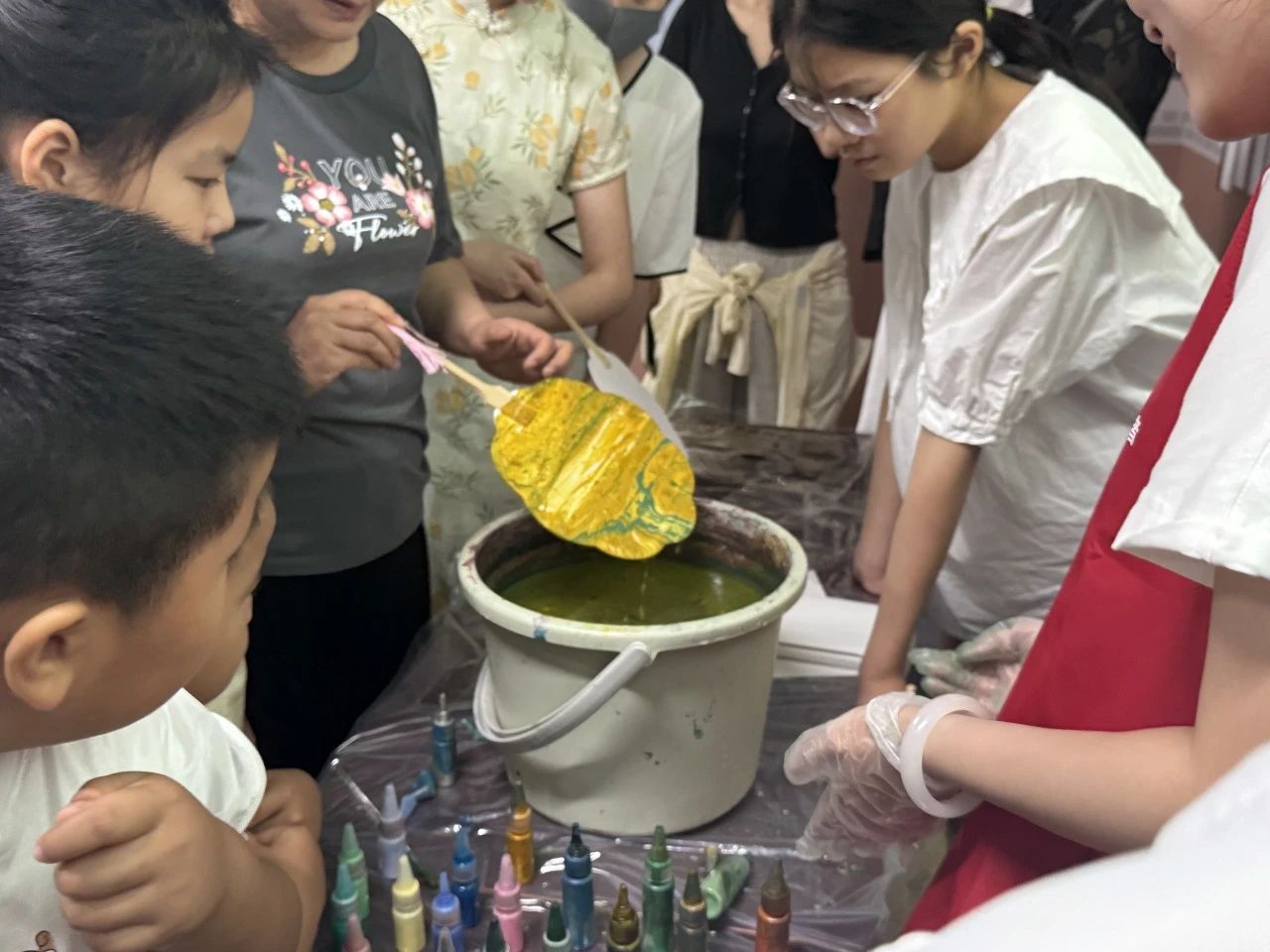 在随后的活动中,社教老师向大家介绍并示范了漆扇制作的常用技巧与手法。在老师的指导下,大家将事先选好的扇面以垂直状轻轻压置水中,花纹便会随着水的流动在扇面上延伸开来,形成一幅美丽的画卷,待将扇子拿出水面,一把独一无二的漆扇便制作完成了。制作好的漆扇不仅成为了观众们手中的艺术品,更是一份满载深情的礼物。