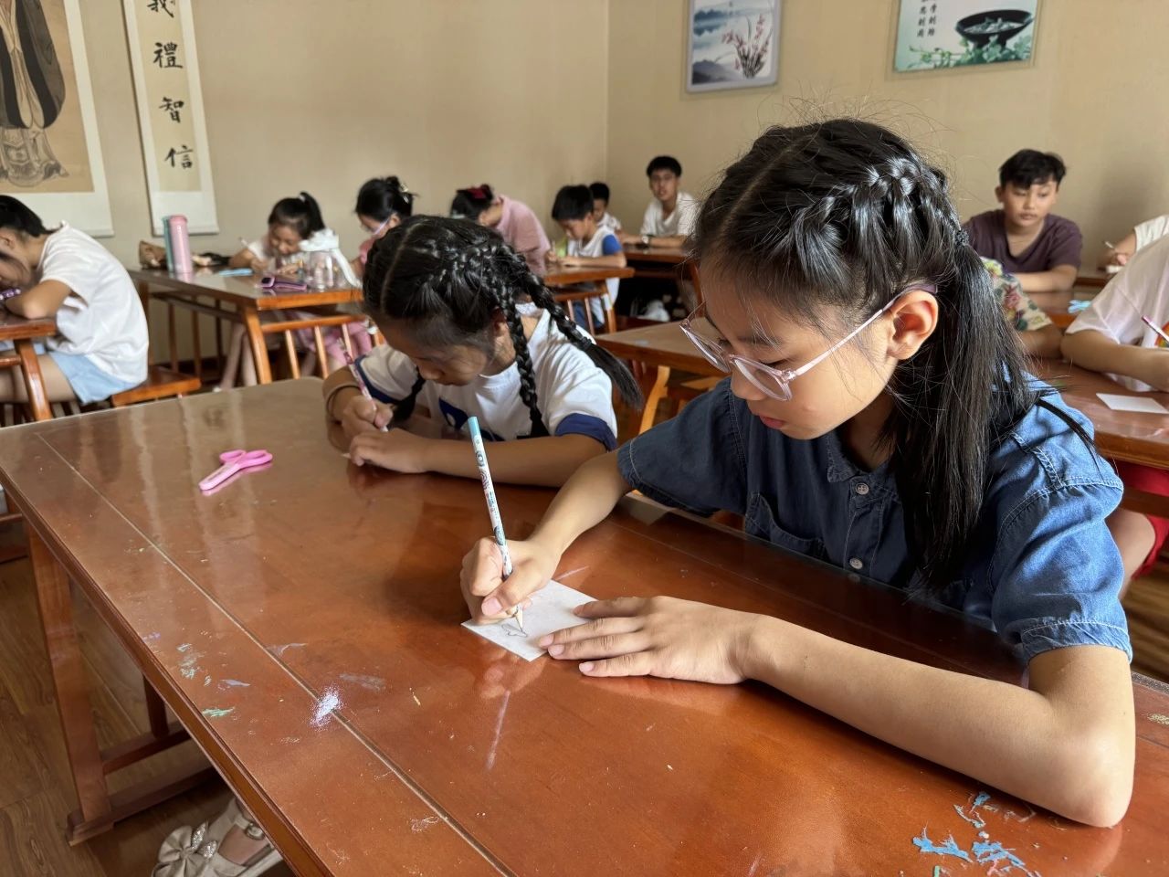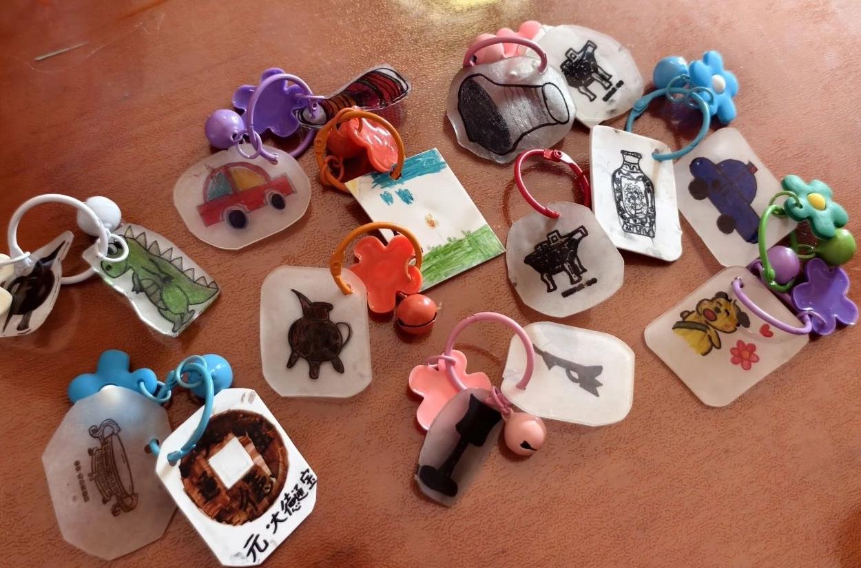 手工环节,同学们兴奋地用铅笔在热缩片上勾勒各种文物的形状并涂上颜色,再根据自己的理解和创意进行装饰,再经过剪裁、打孔、加热后,一枚枚蕴含古韵的文物钥匙扣便诞生了!