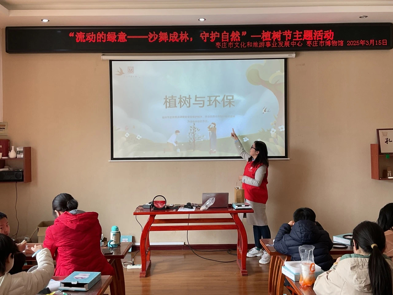 枣庄市博物馆东馆举办了“流动的绿意——沙舞成林,守护自然”植树节3D摆盘制作活动。社教老师以植树节的由来和意义为切入点,向学生们深入讲解了树木与人类的密切关系,强调了保护环境、爱护树木的重要性。通过动态数据可视化为展板,让学生们了解植树造林带给环境的益处;在社教老师生动的演讲下,鼓励了学生们成为绿色生活的倡导者和实践者。
