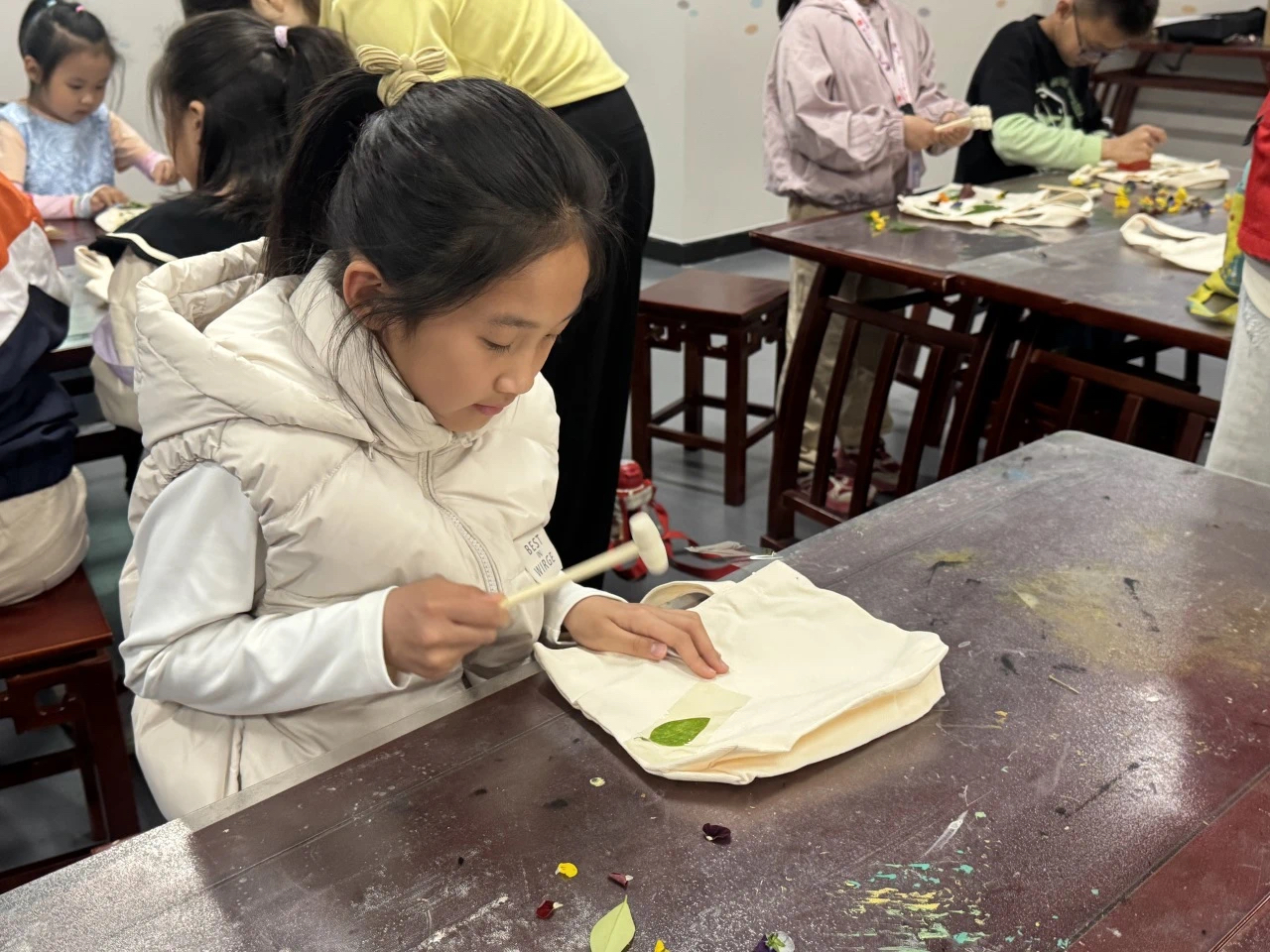 实践环节中,孩子们在指导下精心挑选植物素材,通过布局、固定、敲拓等步骤,将花叶的形态与色彩拓印在棉麻手提包上。每位参与者都独立完成了独具特色的拓染作品,在动手实践中感受非遗技艺的乐趣。