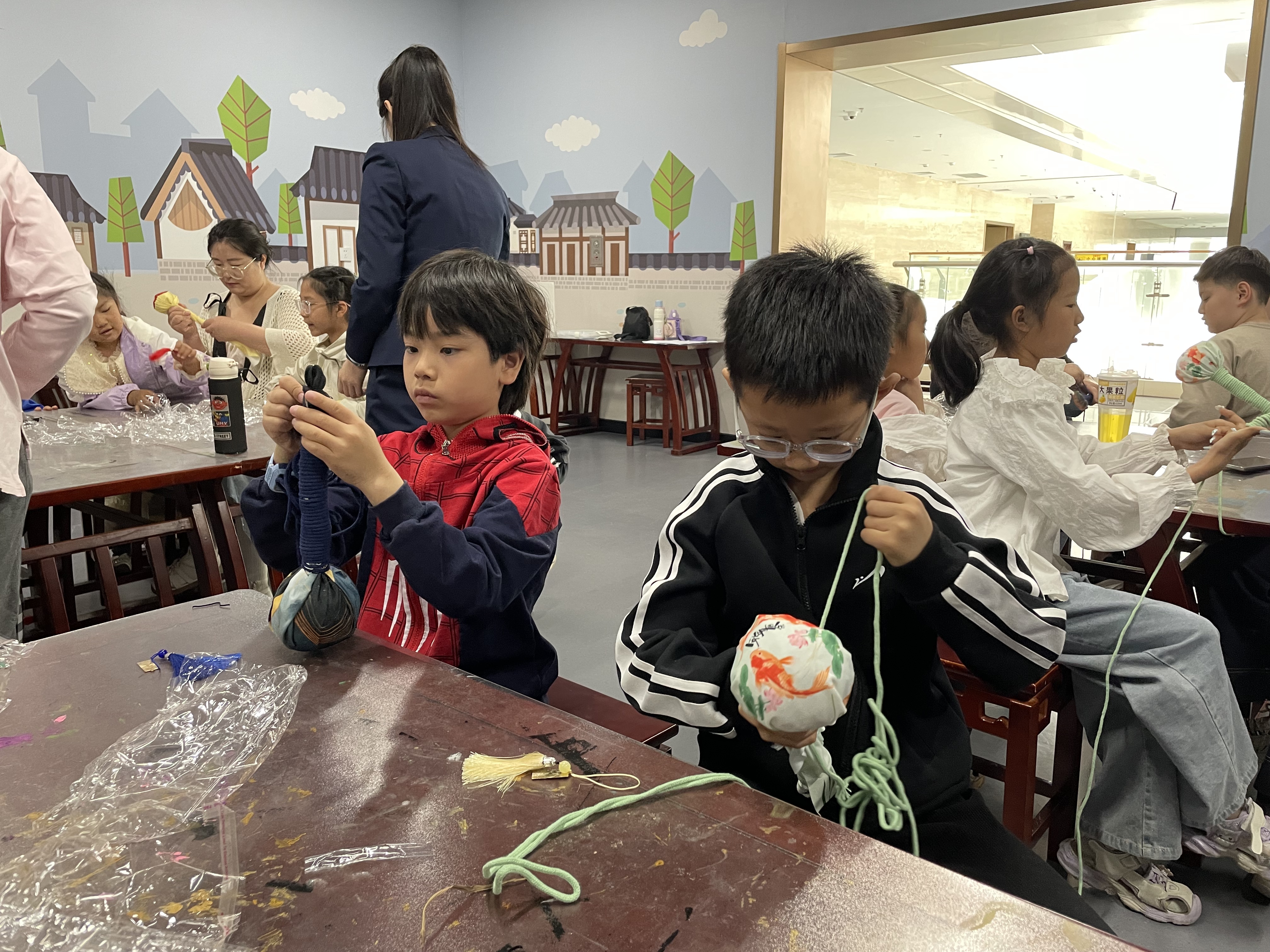 手工环节,孩子们在社教老师的带领下开始制作艾草锤。孩子们小心翼翼地将艾草填入棉布,缝制收口、缠绕彩绳。现场笑声不断,不一会儿,色彩缤纷、香气扑鼻的艾草锤便纷纷“出炉”。