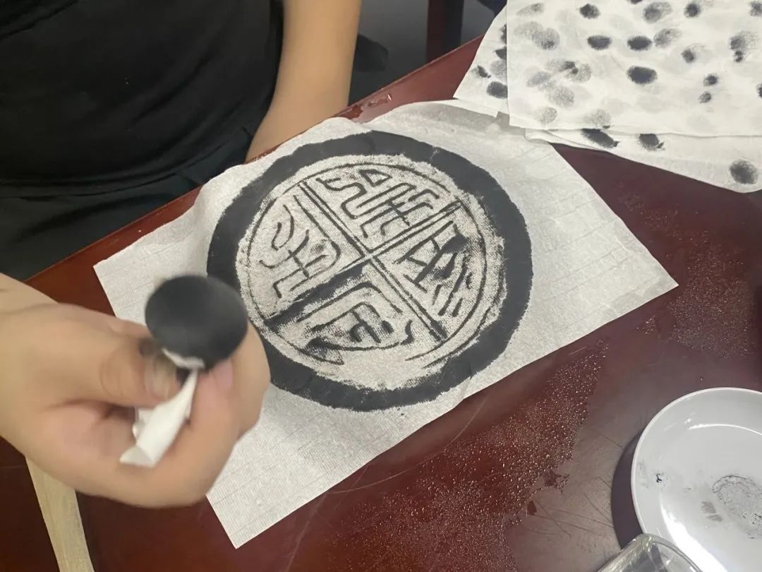 到了手工拓印环节,大家都认真仔细的制作拓印作品,通过在仿古瓦当上铺宣纸—打湿宣纸—用鬃刷拍打—用拓包蘸墨—晾干等步骤,一幅幅精美的瓦当拓印作品便完成了。