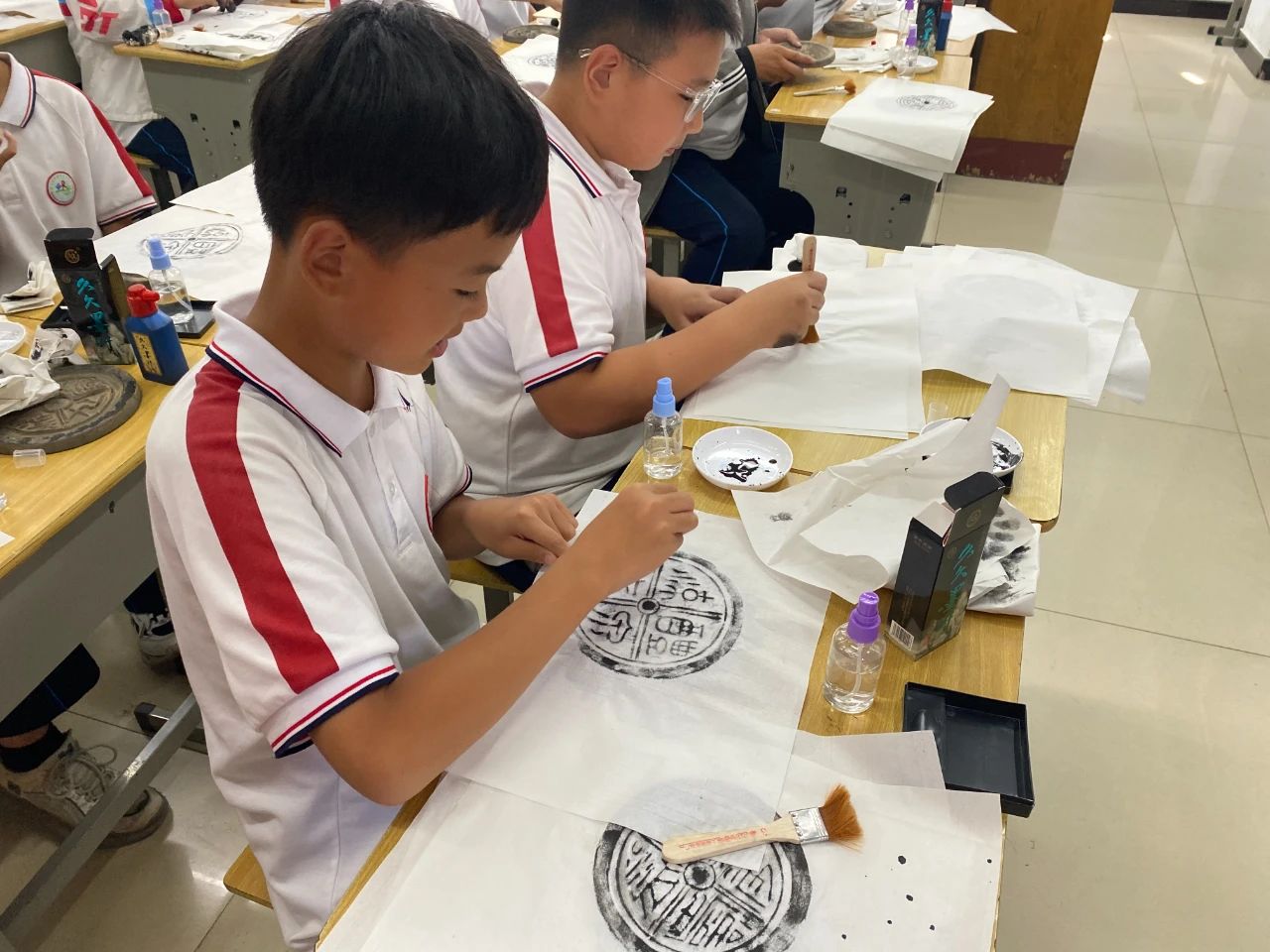 社教老师首先从瓦当概述、烧制流程、瓦当纹饰等三个方面讲述了瓦当的知识,结合视频演示了瓦当拓印的每一个操作步骤,之后在社教老师的指导帮助下,同学们开始动手制作自己的瓦当拓片。看似简易的步骤其实并没有那么简单,一不小心墨刷多了,印出来的黑糊糊一大片,线条就显得笨重。刷版的力度要刚刚好,一气呵成,中间千万不能停顿,否则着墨就不均匀了。同学们一次次尝试,反复试验,不敢有丝毫马虎。功夫不负有心人,一幅生动的拓印版画终于印好了,快来看成品吧!
