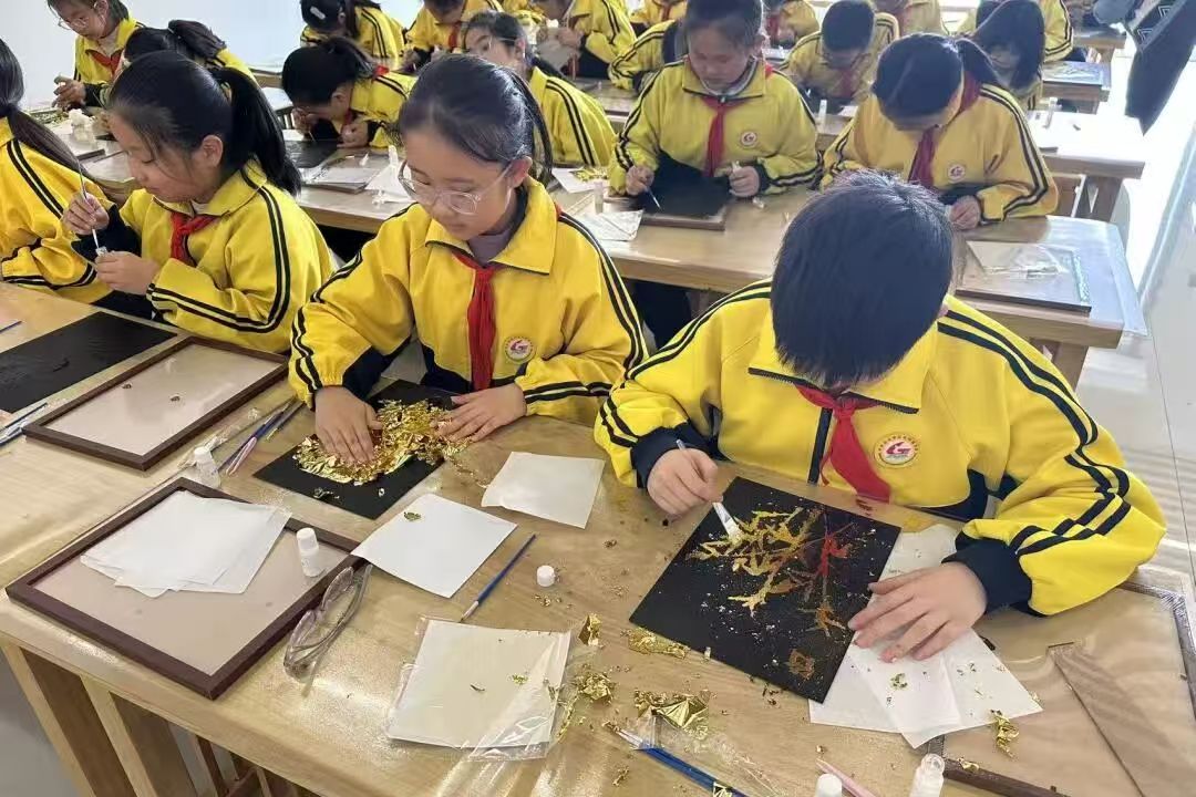 金箔画手作环节,同学们满怀期待化身非遗小匠人。老师现场示范勾勒、涂胶、贴箔、扫金、固色等工序,同学们凝神专注、小心翼翼,将轻薄如翼的金箔精准附着于画稿之上,用指尖赋予金属灵动生机,一幅幅流光溢彩、气韵生动的金箔画作品跃然眼前。