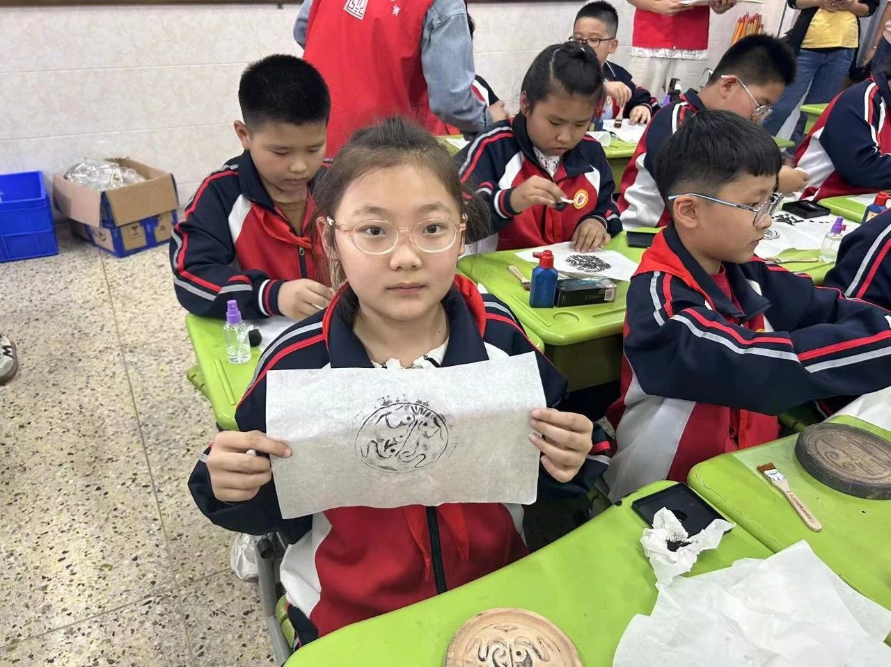 一砖一瓦,沉淀了岁月绵长;一纸一墨,记录了历史的荣光。在照相技术发明之前,拓片是最能准确、传神、完整地记录与传达民族文化的方式。因此社教老师精心准备了“瓦当拓片制作体验”环节,将印有不同纹饰图案的瓦当(复制品)发放到大家手中,指导同学们现场制作瓦当拓片:先把宣纸放在瓦当上,用水喷湿,通过鬓刷轻轻拍打,使瓦当纹饰印在宣纸上,接着用拓包沾取墨水少量多次的拓均匀,最后等待晾干后,一张瓦当拓片就制作完成啦!这次特殊的动手体验,既提升了大家的动手能力,又能通过瓦当拓片的制作感受瓦当纹饰的独特魅力,留存美好的记忆。