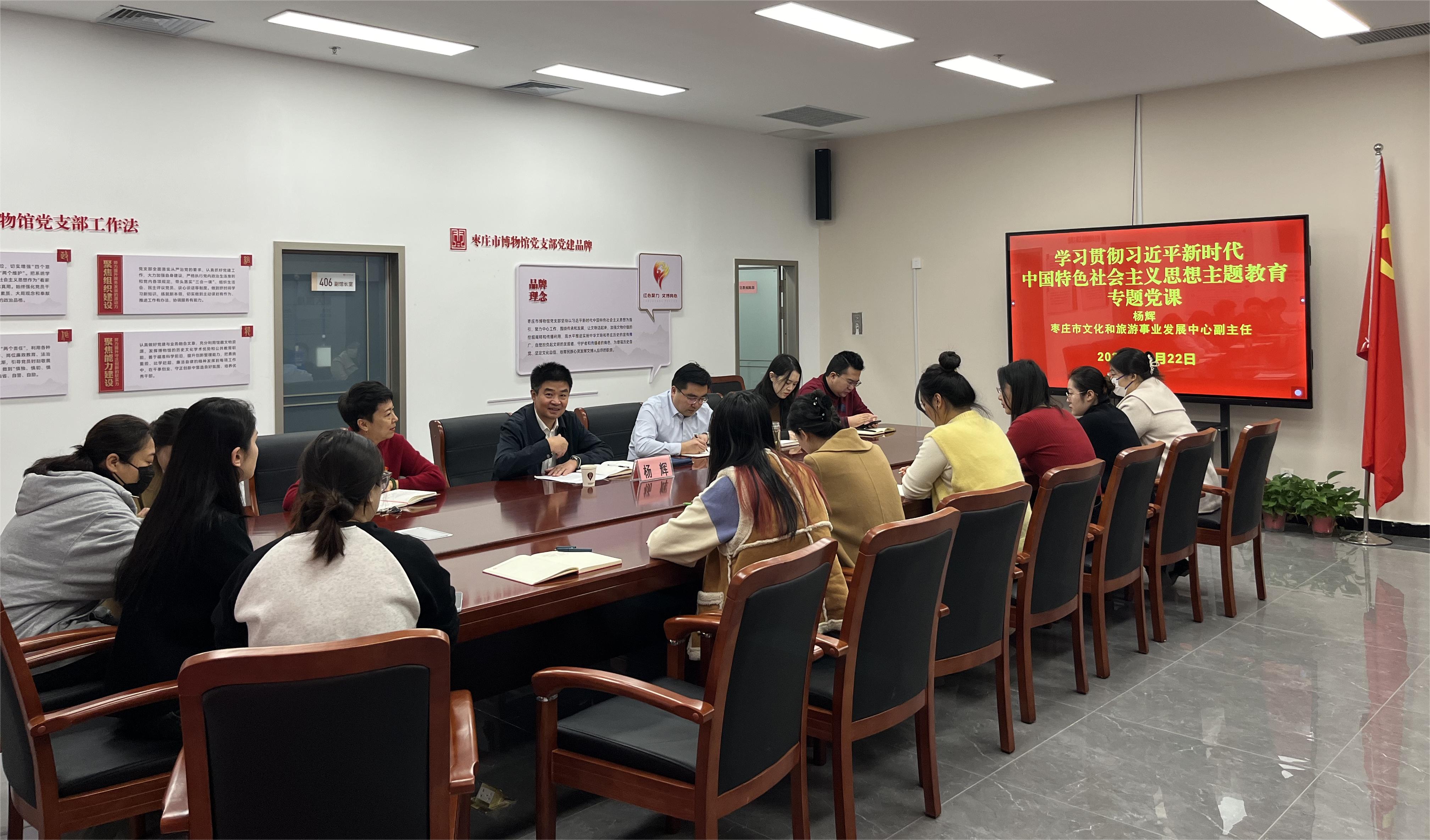 11月22日,市文化和旅游事业发展中心副主任杨辉以“深学笃用 习近平新时代中国特色社会主义思想为建设中华民族现代文明贡献枣庄文博力量”为题,为市博物馆党员干部讲授专题党课。 杨辉以习近平总书记关于文化文物工作的重要批示指示为主线,深入阐述了习近平新时代中国特色社会主义思想的丰富内涵和主题教育的实践要求,提出了如何结合市博物馆实际工作抓好贯彻落实工作建议。专题党课以理论联系实际工作,主旨鲜明、脉络清晰、事例丰富,为更深层次开展好主题教育,做好文博工作做了一次重要的辅导和再一次的部署。 市博物馆将以此次学习为契机,深入学习贯彻习近平新时代中国特色社会主义思想,强化担当,守正创新,不断提高科学谋划工作、解决实际问题、抓好工作落实能力,以市博物馆高质量发展为枣庄文化事业开新局、建新功。