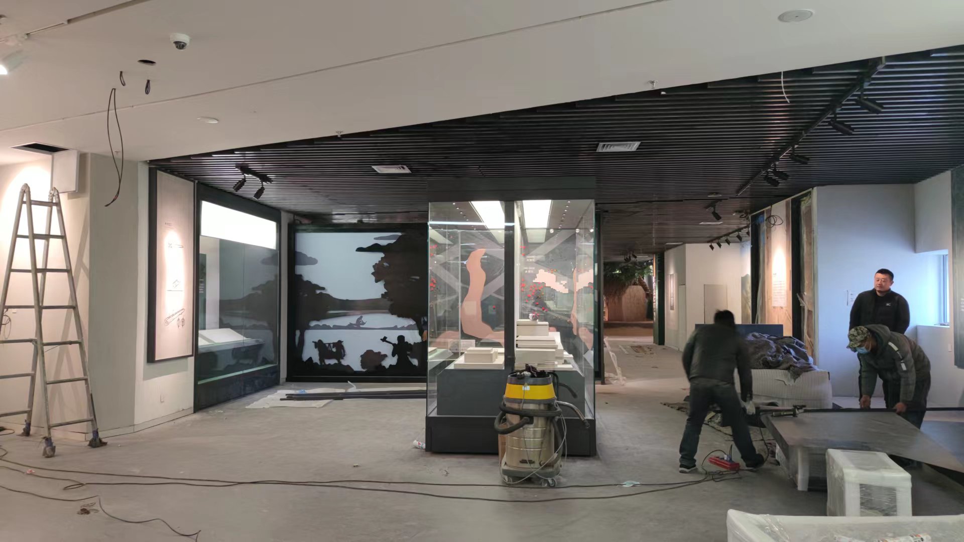 (四)协调完成新馆建设中的各类政府采购项目,积极做好项目的评审、招标和项目资金拨付工作,为新馆建设和对外开放运行打好基础。目前,装饰装修部分,一层完成99%,二层完成99%,三层完成99%,四层完成98%,中庭完成99%,照明灯具安装完成97%;多媒体内容制作基本完成,多媒体布线全部完成,一层设备安装完成100%;展陈部分,一二层场景雕塑场内施工完成,场景雕塑场外施工90%,展柜施工完成,展板安装完成,三四层正在积极推进中。
