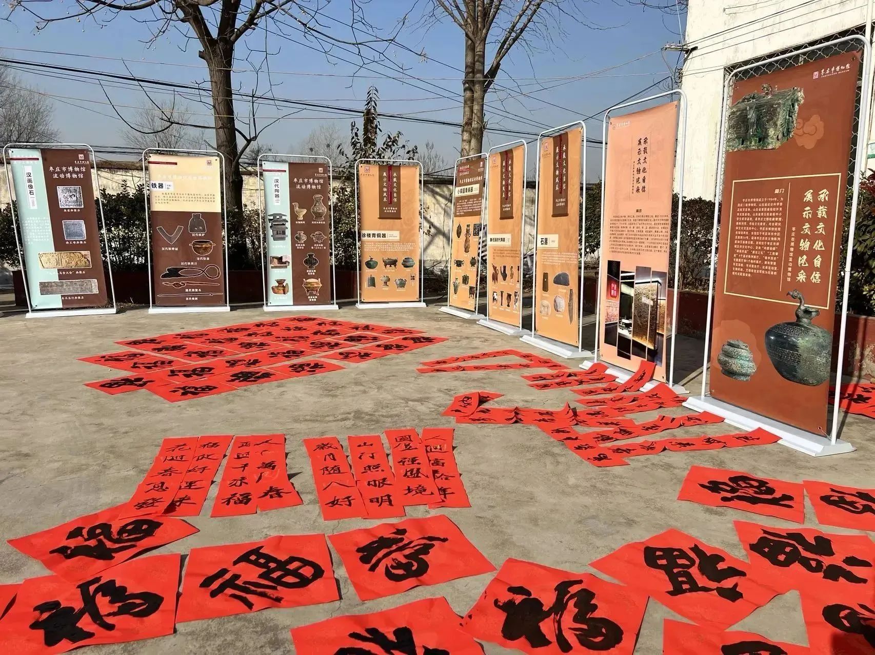 活动现场,摆放了以时间轴为顺序的枣庄地区物质文化发展历程介绍展板,由讲解员为来往的村民详细讲解枣庄的历史发展以及小邾国、徐楼出土青铜器等文物情况,受到村民的热烈欢迎。