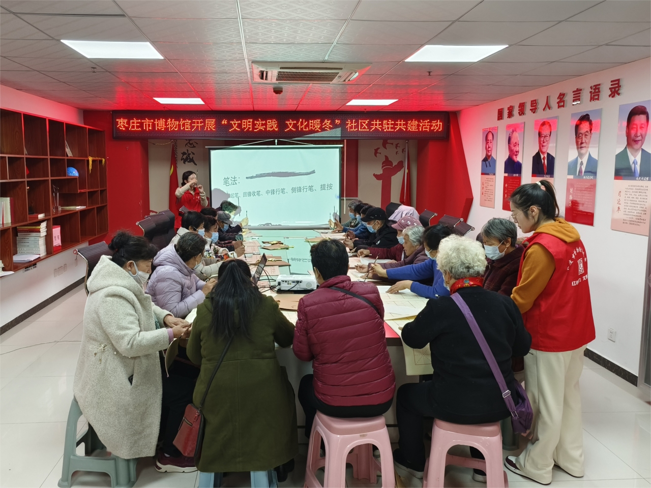 为发挥党建引领作用,强化博物馆社会教育服务职能,以文化惠民点亮群众多彩文化生活,11月17日上午,市博物馆党支部走进高新区光明社区开展“文明实践 文化暖冬”社区共驻共建活动。 活动伊始,博物馆工作人员带领社区居民上了一堂“墨韵汉字”书法体验课。工作人员结合我馆馆藏青铜器上的铭文和石刻碑文,向大家介绍了中国书法的起源、运笔姿势等知识,使他们对书法这门艺术有了更明确的认识和了解。进入动手实践环节后,居民们在工作人员的鼓励下纷纷拿起手中的毛笔,挥毫撒墨,在牛皮纸袋上写下了“山高水长”、“万事如意”等美好词汇,并用含有书法元素的古风贴纸进行点缀。 “墨韵汉字”书法体验课结束之后,居民们又通过展板上展出的文物图片和讲解员的生动讲解,近距离走近文物,触摸历史,感受家乡深厚的历史文化底蕴。市博物馆党支部党员们还向居民发放了文物保护宣传资料,增强了社区居民的文物保护意识,弘扬了中华传统文化。 此次“文明实践 文化暖冬”社区共驻共建活动,丰富了居民的精神文化生活,成功搭建了博物馆与广大群众沟通互动的平台,让文物“活”起来,走到社区居民身边。今后,枣庄市博物馆将进一步在党建工作、文化惠民、志愿服务等方面深入开展各类活动,培育文明之风,提升人文素养,助力文化建设。