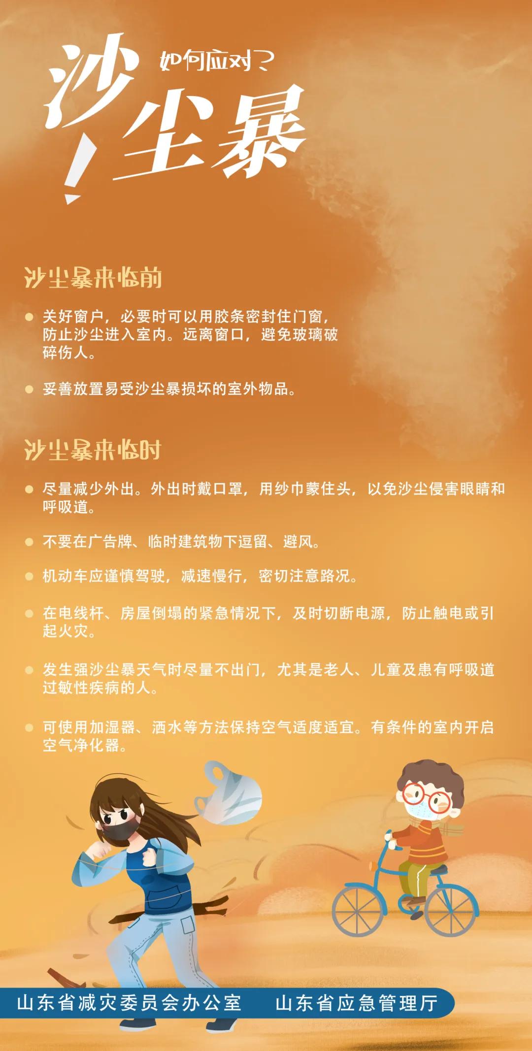 沙尘暴来临时,应及时进行防护,寻求安全的地方躲避。尽量减少外出,如有需要必须开车外出,减速慢行开启大灯和雾灯,尽量避免骑自行车。如果有需要在室外活动,可用湿毛巾纱巾保护眼睛和口鼻,回到房间后及时清洗面部,也可在室内使用空气加湿器保持室内空气清新适宜。