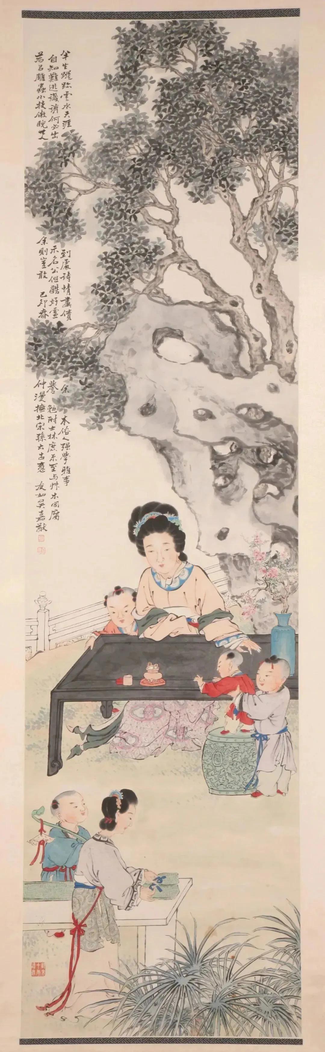 这幅《清吴嘉猷抚孙太左育婴图轴》中,母亲在桌边端坐,身边环绕着嬉戏打闹的孩童,背景中在怪石上蓬勃生长的松柏,也寓意着母亲期望子女能如松柏一般健壮生长。山东博物馆藏