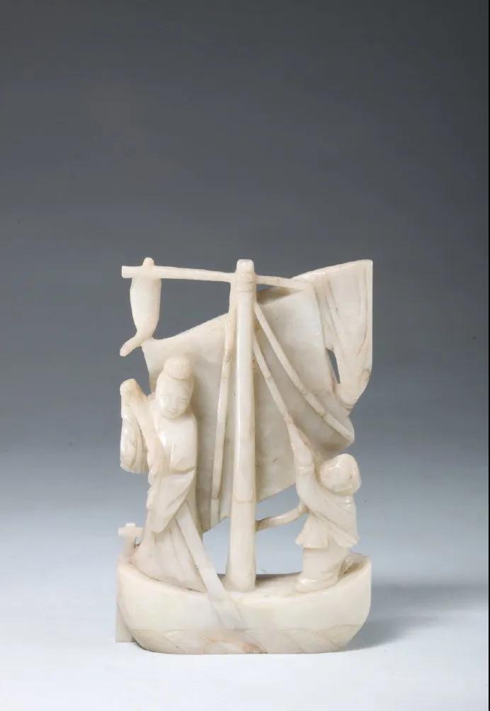 山东博物馆藏的这件白玉雕帆船为母子形象,母亲划船、孩子拉帆,平稳行驶着。寓意母子同心,一帆风顺!山东博物馆藏