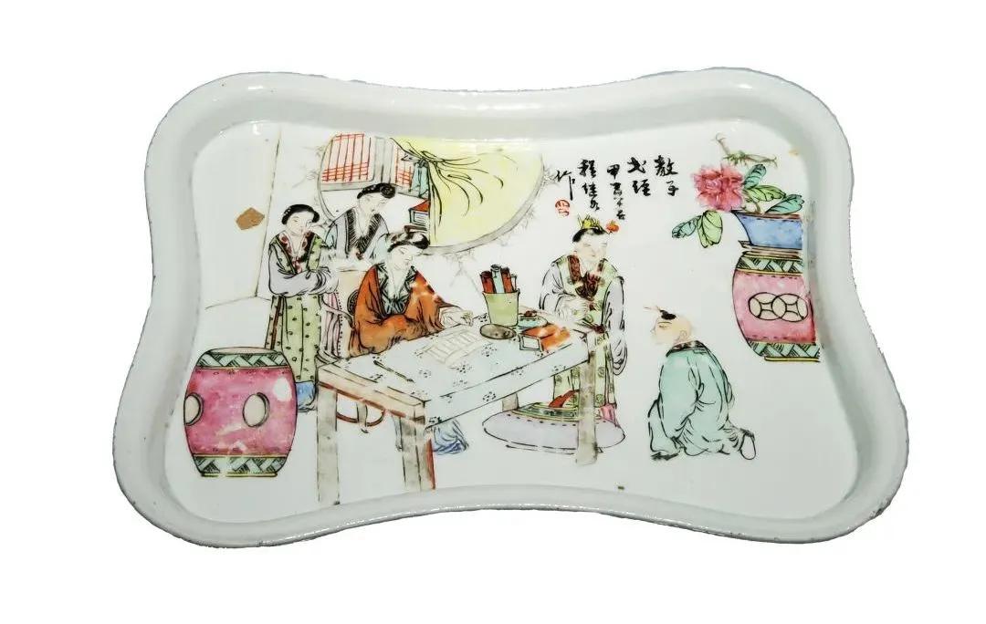 民国·粉彩教子图花形茶盘