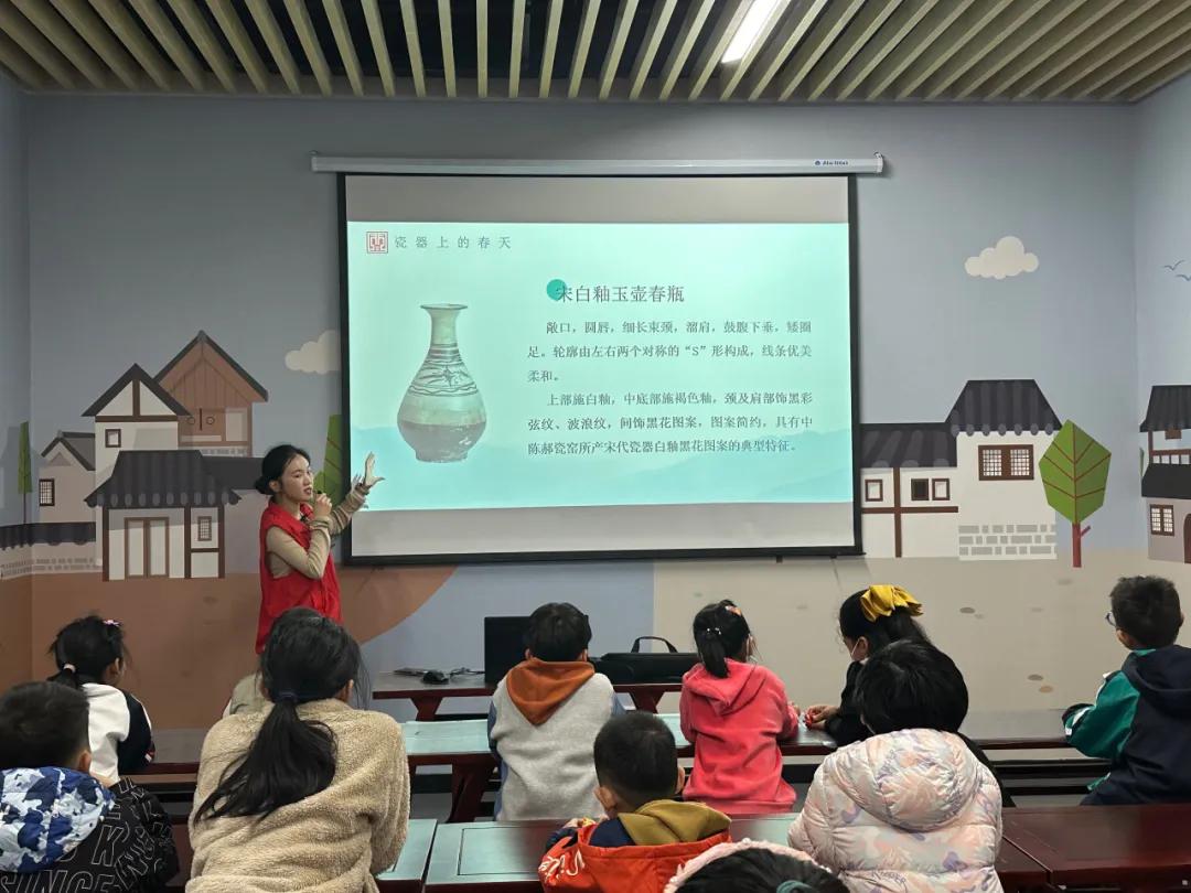 春分,是二十四节气之一,春季第四个节气。春分后,气候温和,雨水充沛,阳光明媚。春分时节,我国民间有放风筝、吃春菜、立蛋等风俗。社教老师通过现场教学、互动体验、视频授课等形式带领同学们学习春分节气由来、传统习俗和关于春分的古诗词,还和同学们一起赏析了中陈郝瓷器上的各种纹饰。