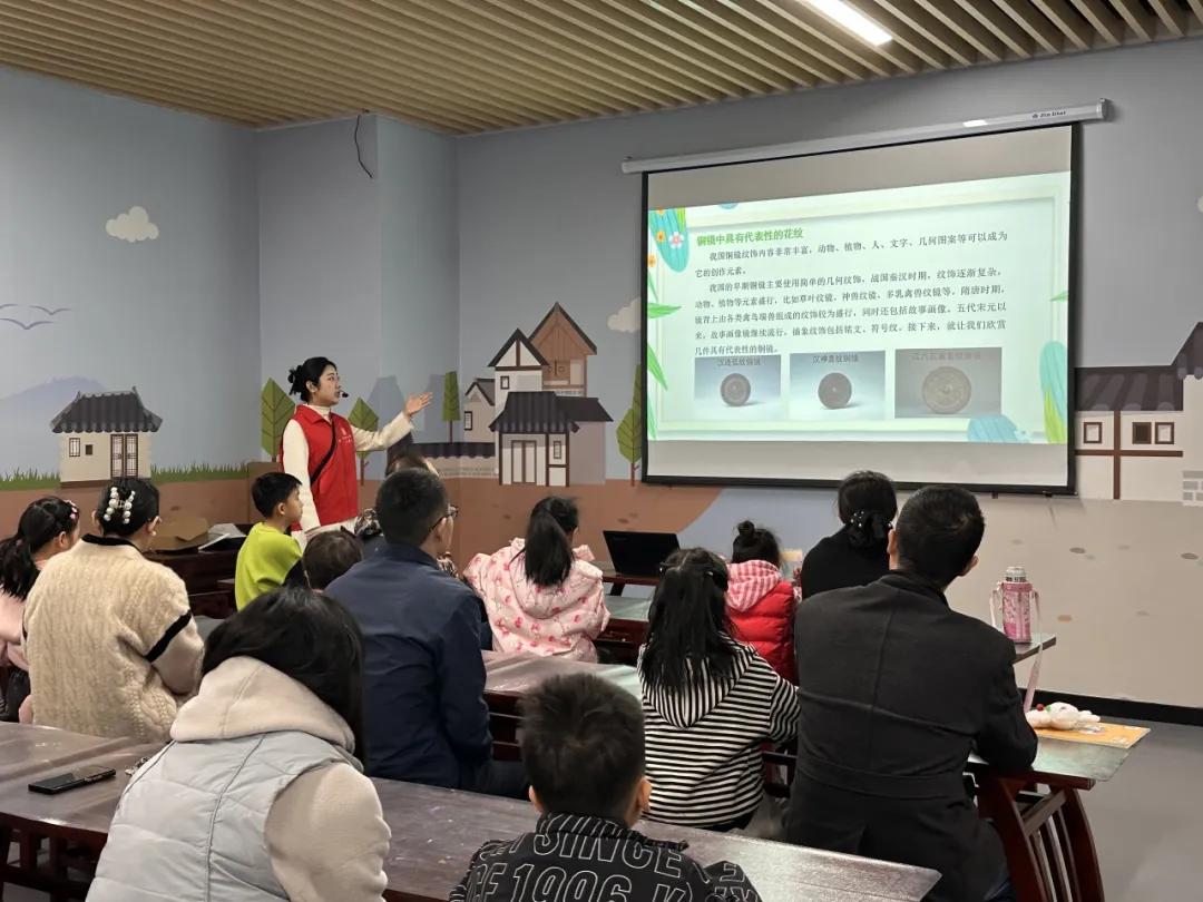 “铜镜,也被称为铜鉴,因古代用铜做镜子而得名。铜镜在古代有着悠久的历史,从最早的商代作为祭祀礼器出现,到春秋战国至秦时期,它主要被贵族所享用。随着时间的推移,到西汉末期,铜镜逐渐走入民间,成为人们生活中不可或缺的一部分。”社教老师先是通过课件将铜镜的历史向大家娓娓道来,一幅幅古人浪漫而热烈的生活图景展现在小朋友们的眼前。