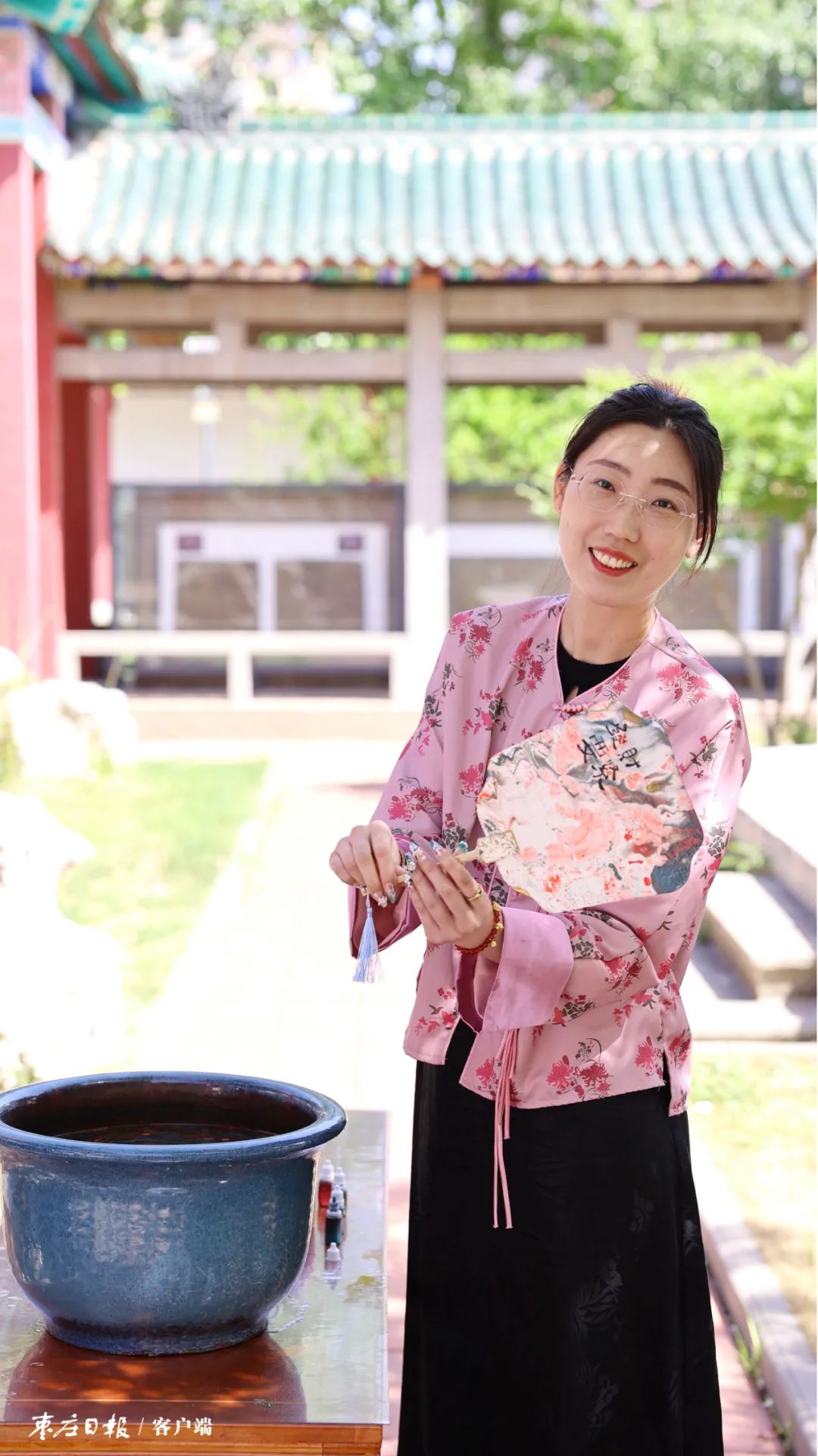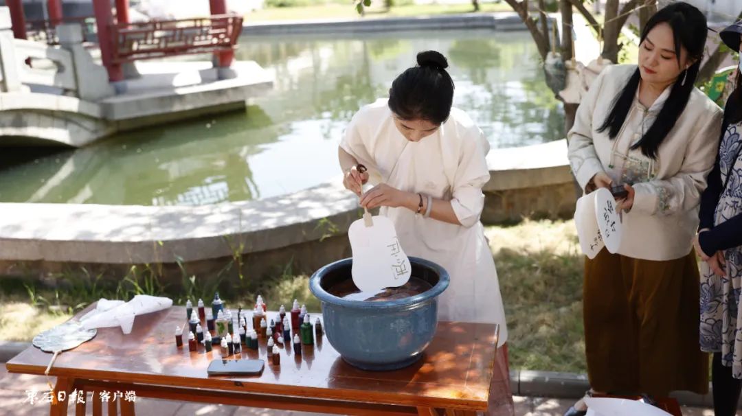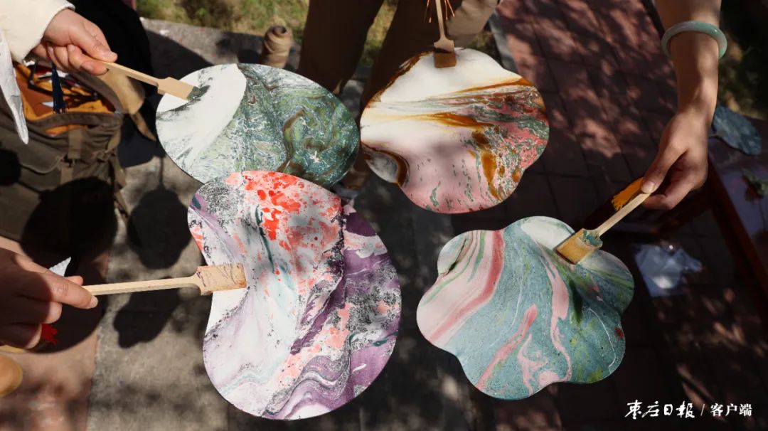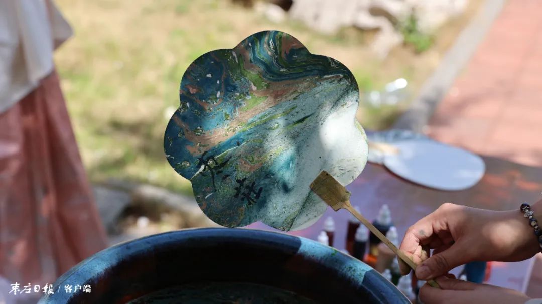 当天的活动地点位于市博物馆东馆,汉画像石廊外池塘绿波、水榭长亭,盛满清水的天青色瓷缸浮光闪耀。在市博物馆宣教展陈部专家的全程指导下,参与者们一一调漆、稀释、配色……再持扇入水,指尖提转之间,扇面被流沙倾泻般的色彩皴染,一件精美独特的作品就这样诞生了。