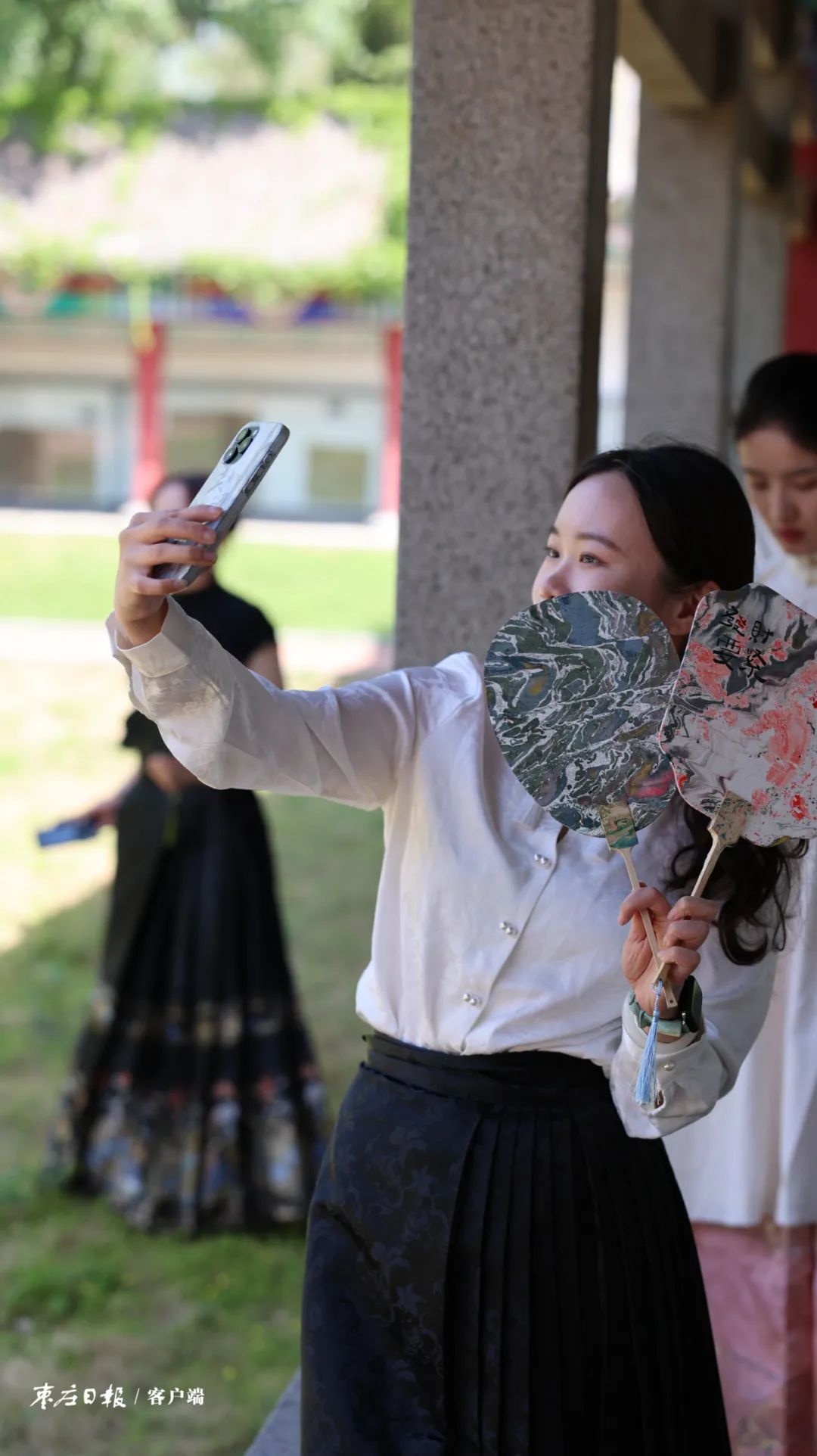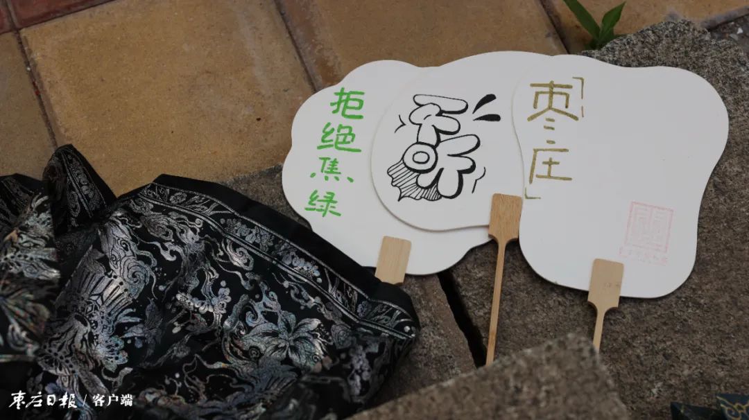 新裂齐纨素,鲜洁如霜雪。裁为合欢扇,团团似明月。扇子是中国古典美学的代表性象征,其中圆形有柄的团扇因为精巧雅致,尤为女性喜爱。当天的参与者中,有公司职员、有青年学生、有汉服爱好者、有本地的网红博主,他们都喜爱传统文化,经常参加市博物馆组织的各类活动。短短一上午,大家精心制作的一把把绚丽多彩的团扇悬挂于博物馆院落间,在轻风中摇摆。身着马面裙、手执漆扇徜徉在石刻长廊,感悟历史、博古览今,“白乳浮盏面,如疏星淡月”,千年浪漫犹如水之丹青,在笑语欢声中本次活动圆满成功。