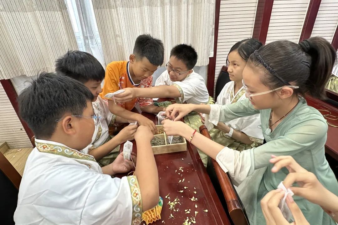 随后的香囊制作体验环节,社教老师耐心细致地为大家讲解了香囊的制作方法和材料选用。从香料的选择到香囊的装填,社教老师对每一个步骤都进行了详细介绍和示范。同学们认真聆听,踊跃尝试,通过小组互动的形式,亲手制作香囊,感受传统文化的魅力,传承华夏文明。