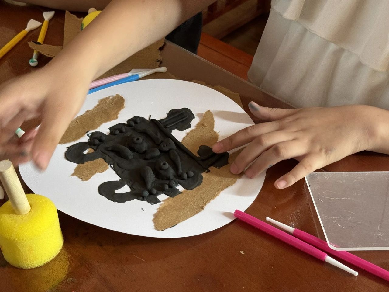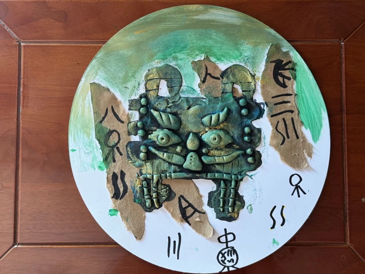 社教老师向大家讲解如何运用粘土塑造出青铜器的大致形状以及用丙烯颜料进行上色时的注意事项后,孩子们便迫不及待地开始动手制作,经过勾线条,捏形状,涂颜料等步骤,一幅幅各具特色的青铜器浮雕仿铜画便制作好了,一些孩子还发挥了自己的想象力,对青铜器进行了创新设计,展现了独特的创意和思维。