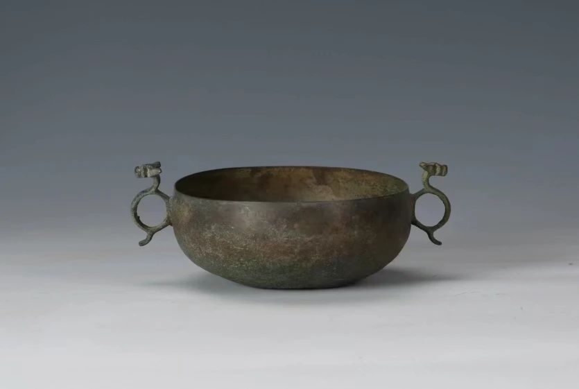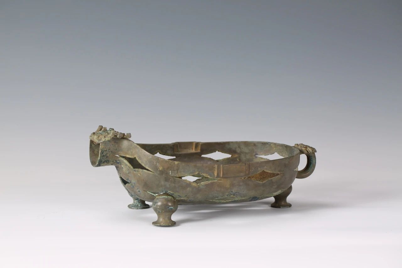 铜舟,2009年峄城区徐楼M2出土。椭圆形,口微敛,尖圆唇,浅腹,上腹近直,下腹弧内收,平底。腹部两长边的中间上部各铆有一兽首形环耳。器壁较薄,热锻而成。腹壁内底錾刻细密的交体龙纹一圈,内有蟾蜍纹和椭圆形四叶纹。