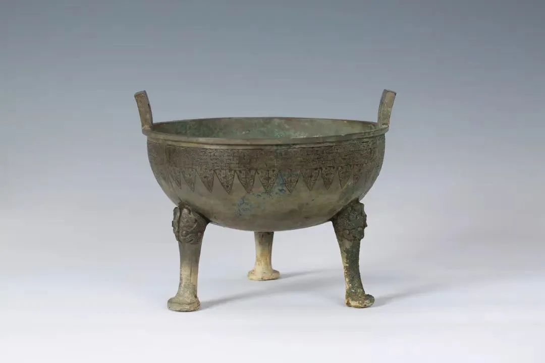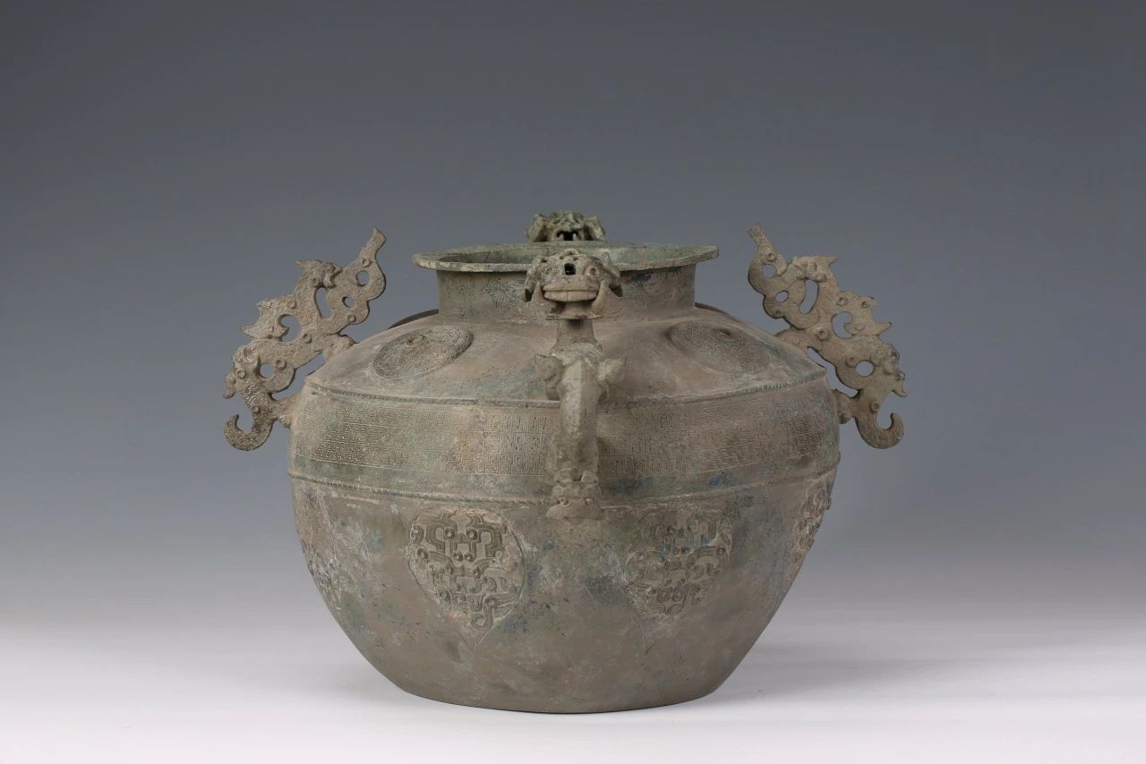 铜浴缶,2009年峄城区徐楼M1出土 。侈口,宽折沿,方唇,直颈,丰肩,深鼓腹,最大腹径偏上,平底,三矮蹄足。肩部有四枚两两对称的附耳,一组为双龙相衔片状耳,另一组为衔尾顾首双龙立耳,顾首龙獠牙外露,面目狞厉,肩部间饰四枚隆起的圆涡纹,涡纹中间饰圆目纹,外交错饰S形纹、重环纹各两周,腹上部饰2周绹索纹,间饰蟠虺纹,下腹饰八组桃形纹,内饰蟠螭纹组成的兽面纹。