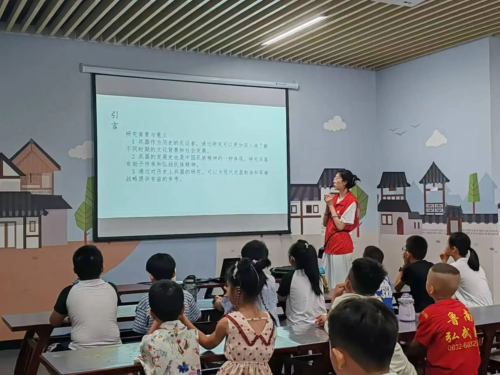课堂上,社教老师作为主讲人,带领同学们踏上了一场穿越时空的历史之旅。活动分为两大主要环节:一是对兵器知识的普及与建军精神的传承,从古代兵器、文物中的兵器、现代中国兵器的发展与和平下的中国兵器文化四部分向同学们讲述;二是对春秋时期枣庄出土的古代兵器进行深入介绍,以“战车”和“戈”为焦点揭开古兵器的神秘面纱。