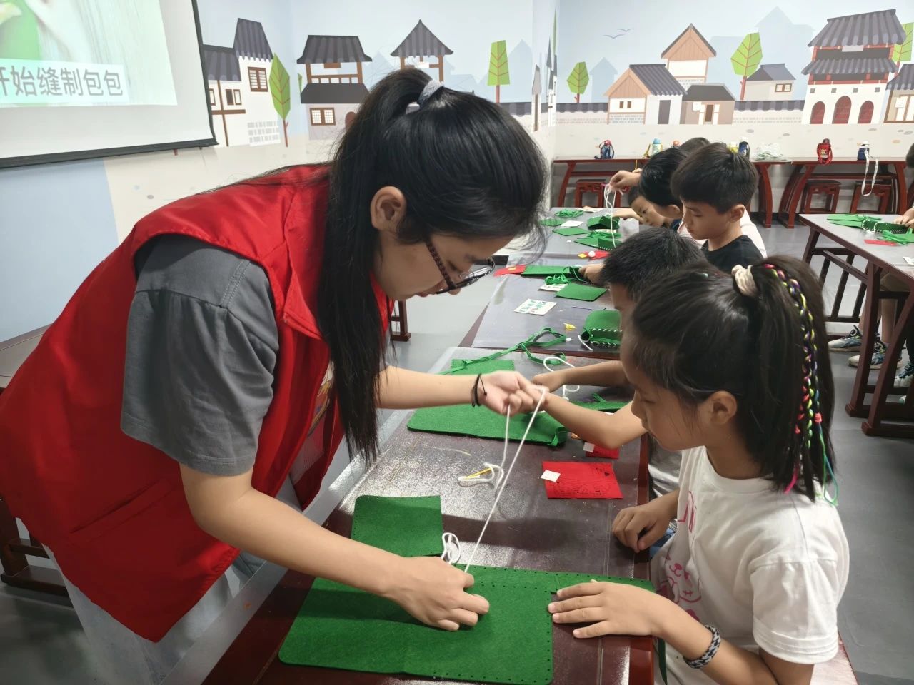 随后在手工制作环节,社教老师分发了制作材料,并详细讲解了红军包的制作步骤。同学们开始穿针、缝线、粘贴......不一会,一个个印有“五角星、闪闪红星、为人民服务”等文字的小红军包便制作好了。小小的红军包中满载着同学们对祖国的热爱之情和对军人们的敬仰之情。