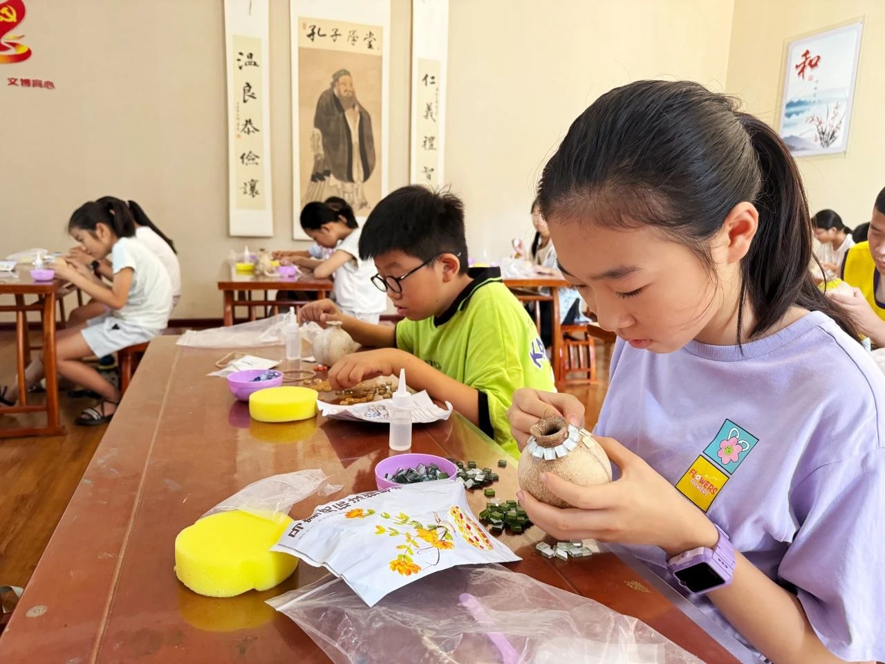 活动将历史文化与现代创意手工相结合,通过制作马赛克花瓶,同学们亲身体验了从构思到成品的全过程。他们认真挑选马赛克片,耐心粘贴,细心打磨。