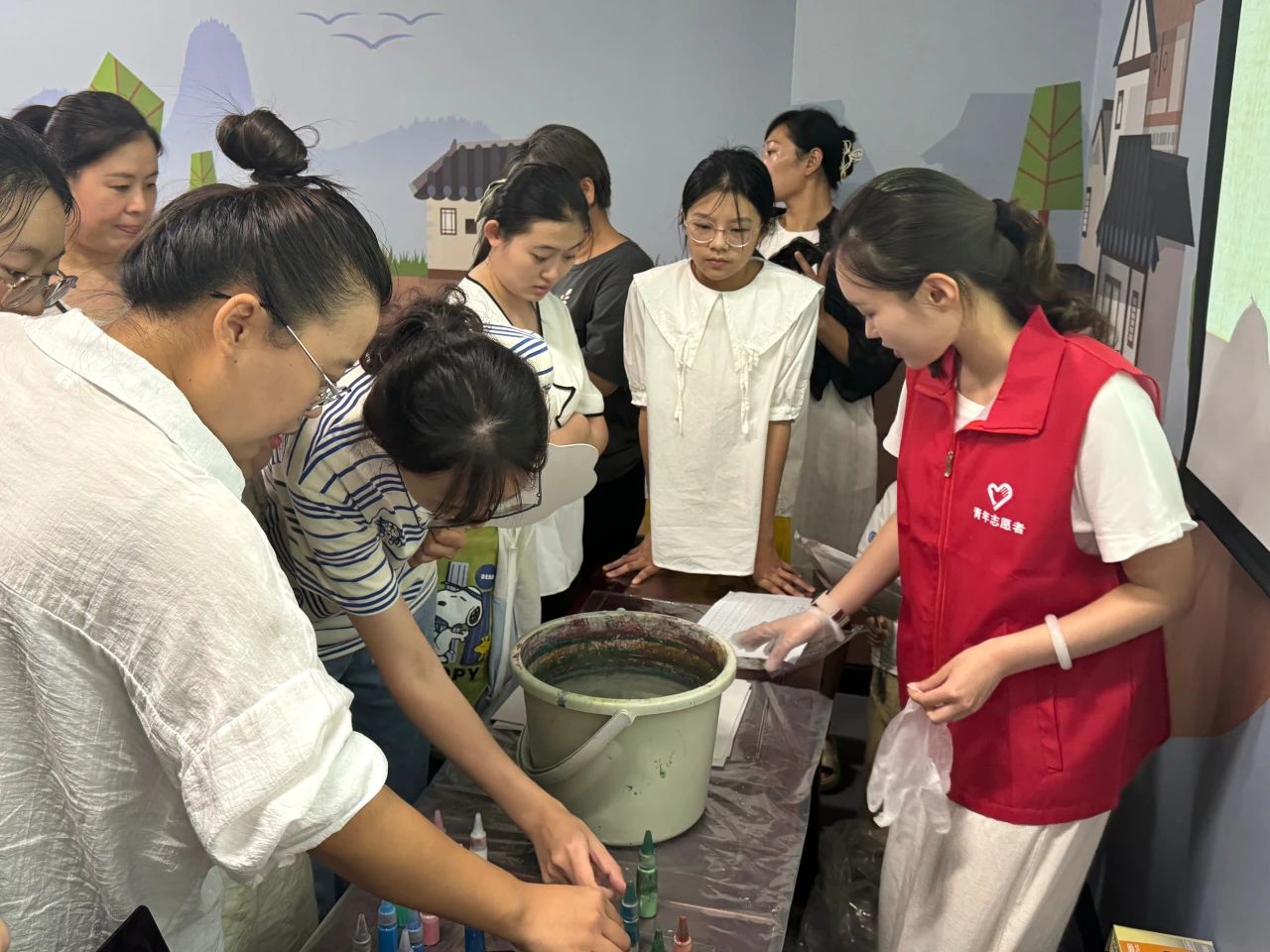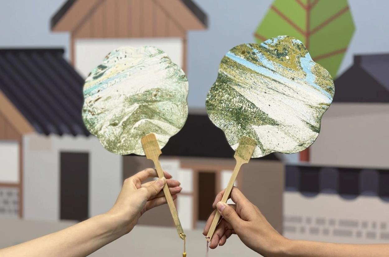 在随后的活动中,社教老师向大家介绍并示范了漆扇制作的常用技巧与手法。在老师的指导下,大家将事先选好的扇面以垂直状轻轻压置水中,花纹便会随着水的流动在扇面上延伸开来,形成一幅美丽的画卷,待将扇子拿出水面,一把独一无二的漆扇便制作完成了。制作好的漆扇不仅成为了观众们手中的艺术品,更是一份满载深情的礼物。