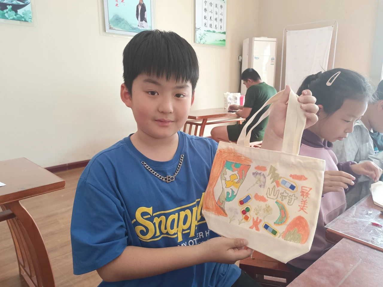 孩子们捧着自己亲手制作的拓染手提包,脸上洋溢着自豪与满足的笑容。在欢声笑语中,此次 “植韵拓染” 研学活动圆满结束。通过这次活动,孩子们不仅拓宽了知识面,深入了解了非遗拓染技艺和春天植物的知识,更在动手实践中锻炼了能力,感受到了传统文化与自然之美的独特魅力。