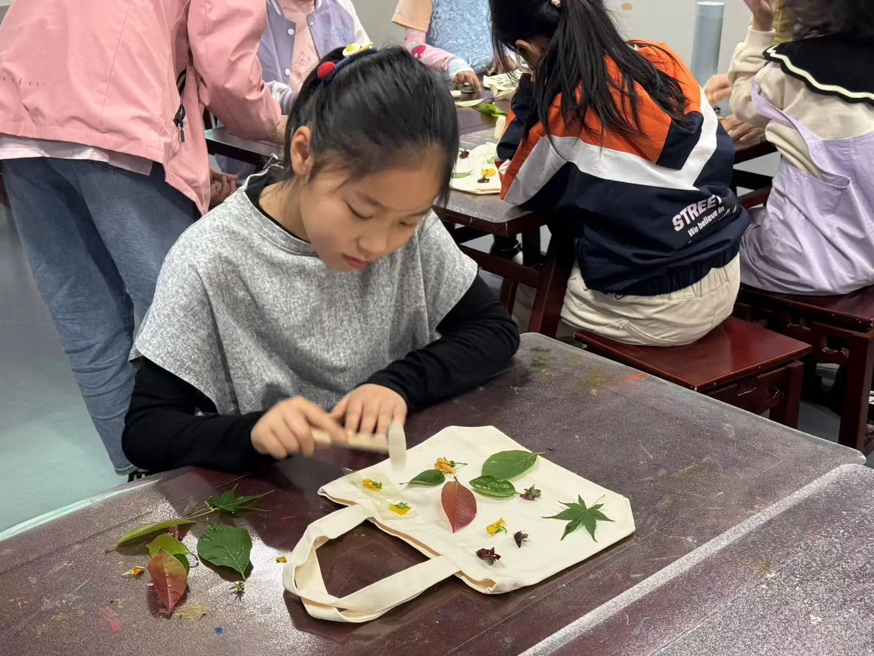 实践环节中,孩子们在指导下精心挑选植物素材,通过布局、固定、敲拓等步骤,将花叶的形态与色彩拓印在棉麻手提包上。每位参与者都独立完成了独具特色的拓染作品,在动手实践中感受非遗技艺的乐趣。