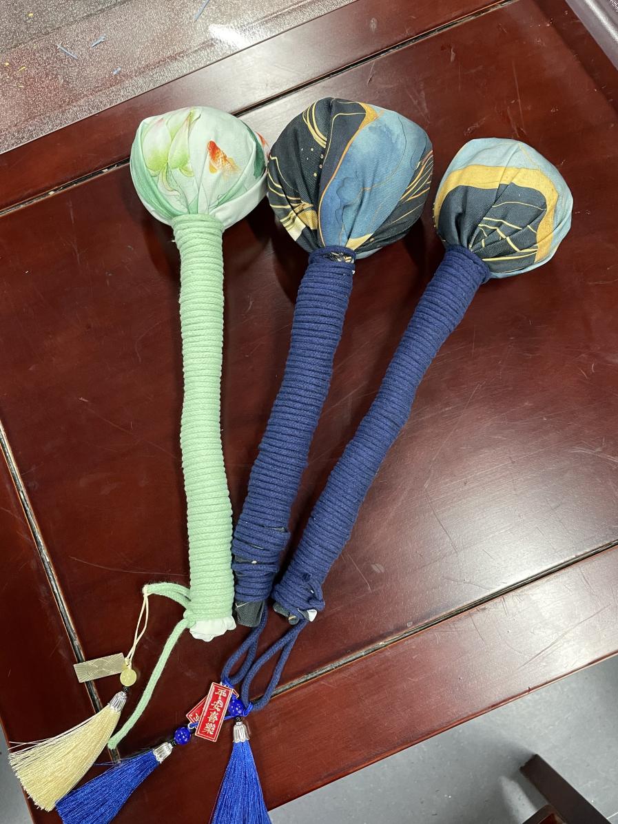 手工环节,孩子们在社教老师的带领下开始制作艾草锤。孩子们小心翼翼地将艾草填入棉布,缝制收口、缠绕彩绳。现场笑声不断,不一会儿,色彩缤纷、香气扑鼻的艾草锤便纷纷“出炉”。