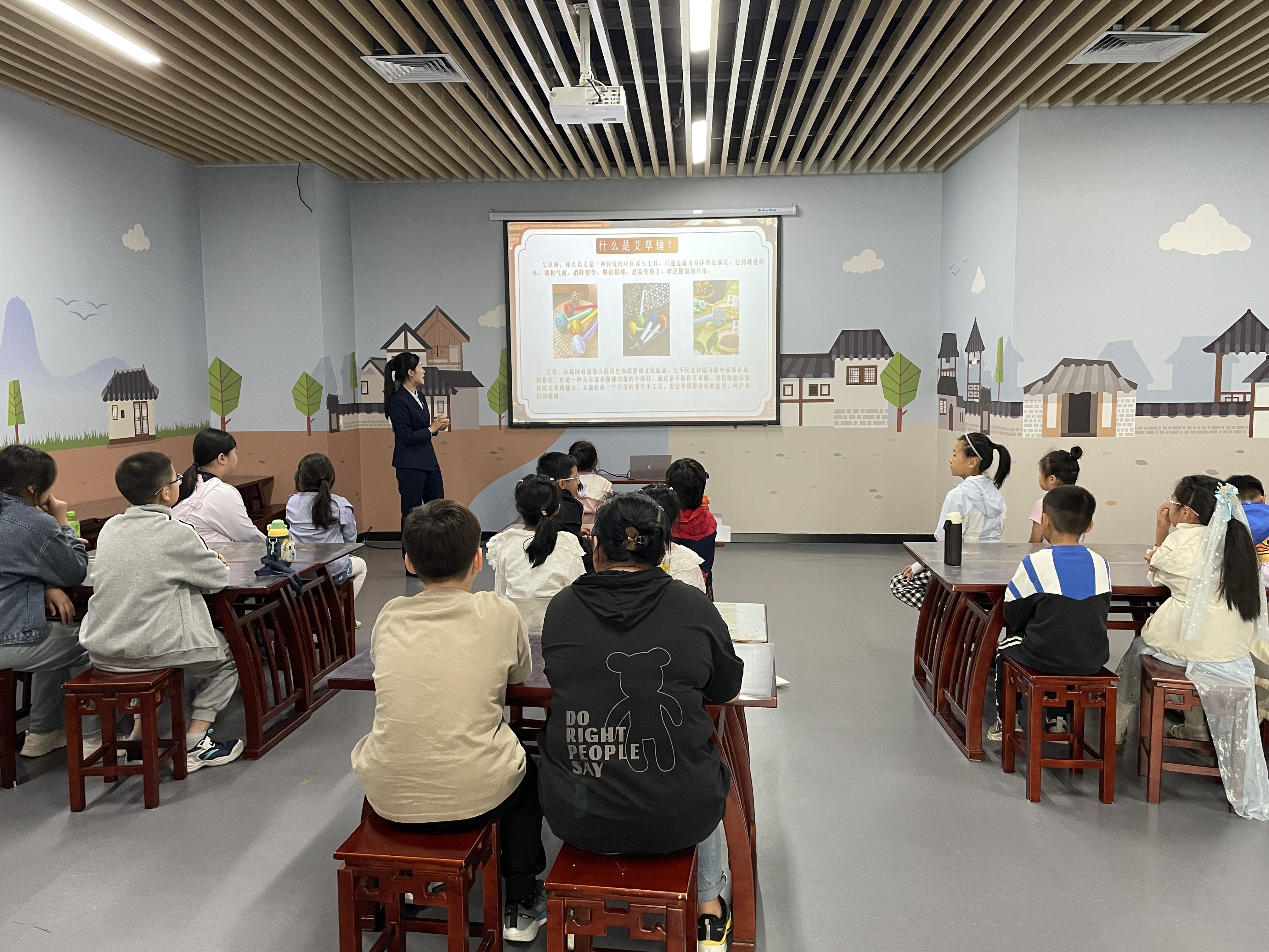 活动伊始,社教老师通过趣味问答和实物展示,带孩子们认识艾草的药用价值与文化寓意,并向孩子们介绍艾草锤的历史来源和使用方法。