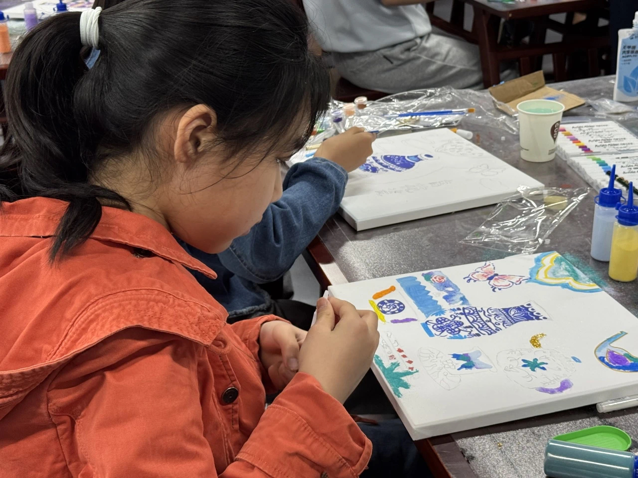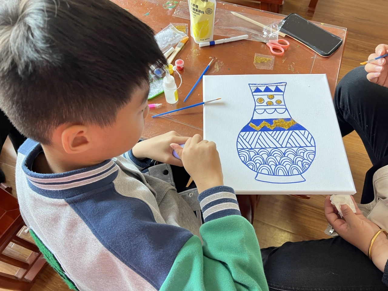 在了解了青花瓷的相关知识后,进入了充满趣味的青花瓷沙画制作环节。参与者们纷纷发挥自己的创意,用彩笔、颜料在画板上创作出心中的青花瓷图案,再加以珍珠、彩沙进行装饰。