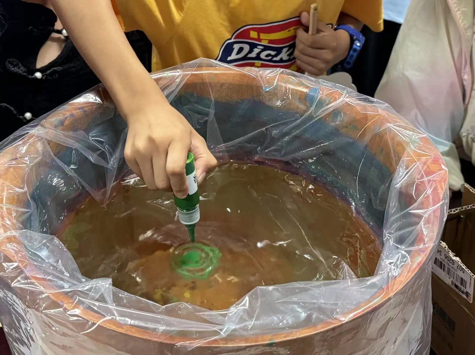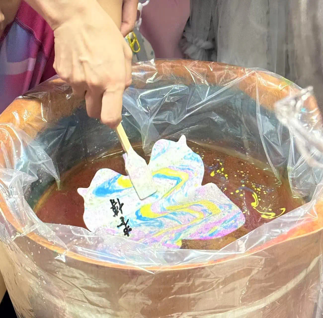 本次活动的核心环节——漆扇制作正式开始。老师现场演示了漆扇的制作方法和技巧,详细讲解了每一个步骤和注意事项。漆扇制作过程精细,从颜色的选择到渲染的技巧,都凝聚着传统手工艺人的智慧与心血。在老师的指导下,参与者们跃跃欲试,亲自动手体验漆扇制作的乐趣。大家精心挑选喜欢的颜色,小心翼翼地将漆料滴入水中,通过点、甩、弹、划等手法,让漆料在水面上晕染出独特的图案。随后,将扇面缓缓浸入水中,让流动的色彩附着在扇面上,一把把独一无二的漆扇就此诞生。