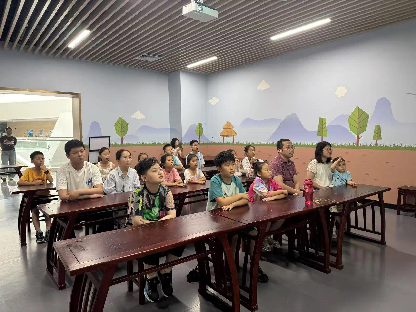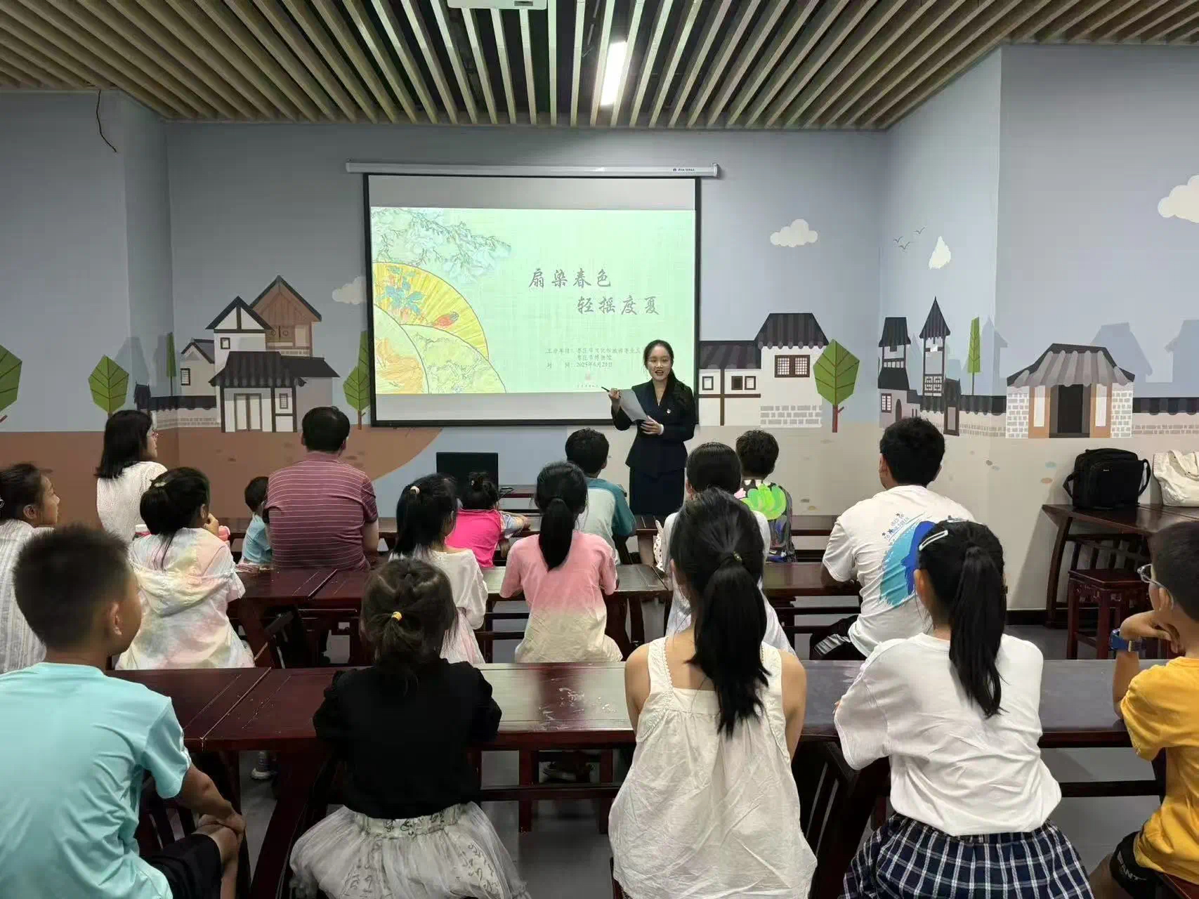 在对古代生活有了深入了解后,老师开始讲述扇子的发展历程。扇子起源于远古,最初是先民的遮阳工具。后来,扇子逐渐成为皇家贵族彰显身份的象征,工艺也愈发精美。随着时代变迁,扇子慢慢走入民间,从宫廷专属变为百姓日常纳凉的实用之物,不仅功能更加多样,还融入诗词书画等元素,承载起丰富的文化内涵。