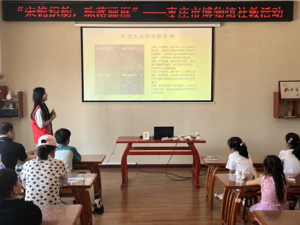 活动开始,社教老师化身 “织锦导游”,带领孩子们了解宋锦的起源与发展。宋锦作为中国传统三大名锦之一,其织造方法、图案纹样都与其他织物大不相同,通过对宋锦的类别、运用以及纹案的介绍,孩子们对宋锦产生浓厚兴趣。课程中,社教老师对比展示了元、明、清时期的宋锦,每一幅锦画都如同一幅画卷,徐徐展开中国古代织造工艺的辉煌篇章。