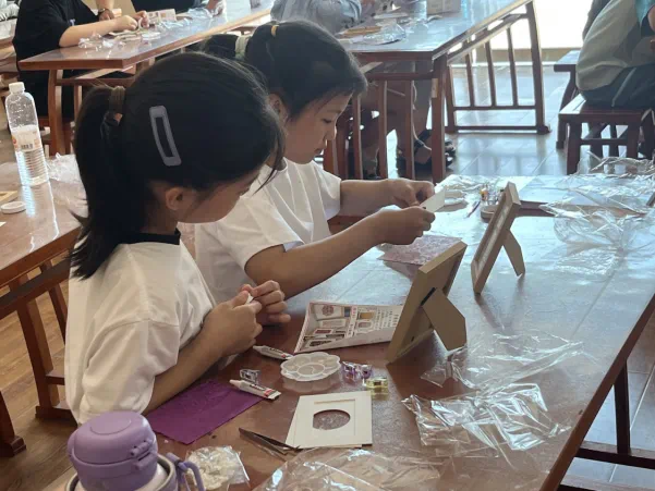 制作环节,孩子们运用色彩斑斓的宋锦、圆润光洁的珍珠,制作出一幅幅美丽的“宋锦珍珠画”。现场氛围热烈而温馨,孩子们相互交流创意,分享制作心得,在一针一线、一珠一贝间,感受着传统手工艺的独特魅力。