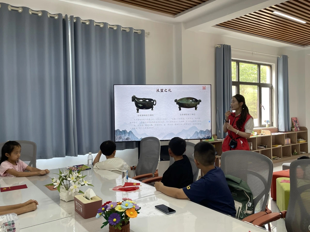 在讲解“沃盥之礼”时,社教老师展示了春秋铜镶嵌红铜匜与春秋铜镶嵌红铜盘的图片,孩子们聚精会神,眼睛里闪烁着好奇与探索的光芒。他们真切地感受到了时代变迁对青铜器风格的深刻影响,也对历史的发展脉络有了更直观的认识。