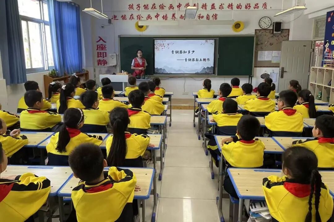 在手工实践环节,学生使用黏土进行“青铜器复刻”创作。学生们对照文物模型,认真模仿器型结构与纹饰细节,从捏制鼎足、塑造爵身到刻画简单纹饰,全程专注投入,既锻炼了动手能力,又在实践中深化了对青铜器造型特点的认知。学生们在实践中感受古代工匠的智慧,进一步激发了对传统文化的兴趣。