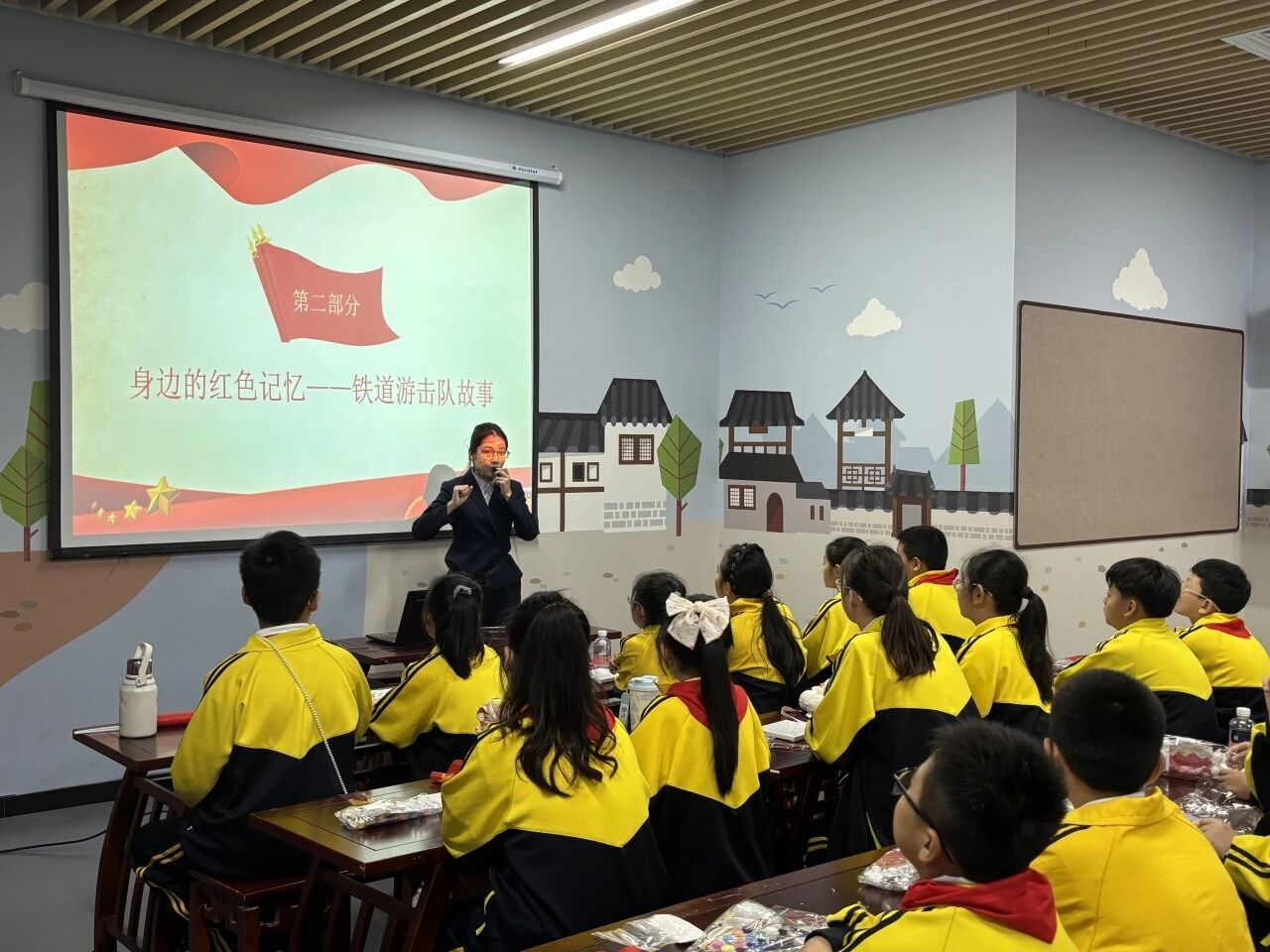 随后,社教老师将话题引向枣庄本土的红色传奇:“在我们脚下的这片土地上,铁道游击队曾书写下壮丽篇章。1938 年日军侵占枣庄后,洪振海、王志胜等人组建铁道游击队,他们扒火车、截物资、破坏日军交通线。就像《弹起我心爱的土琵琶》里唱的那样,战士们趴在铁轨旁,用血肉之躯与敌人周旋。在沙沟受降仪式中,这支传奇队伍更是迫使千余名日军缴械投降”!这些鲜活的历史故事,让 “爱国” 二字不再抽象,化作了触手可及的精神火炬,在孩子们心中悄然点燃。